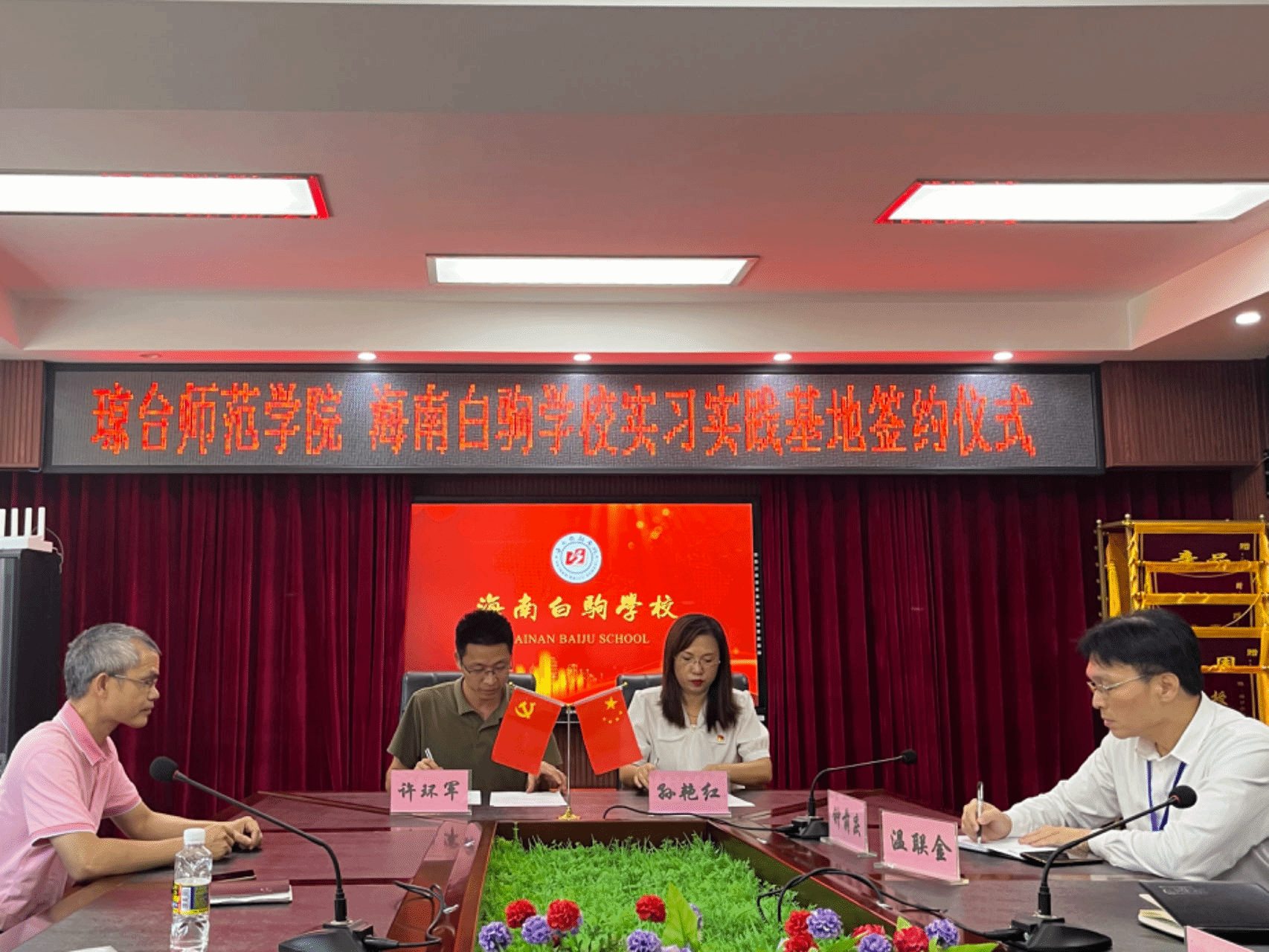 最后,来到海口市白驹学校,孙艳红校长邀请我校老师们欣赏白驹学校举办的第二届科技节之变废为宝时装秀,该活动举办的精彩且细致,直观地体现出了白驹学校的环保育人理念。随后,在双方的座谈会上,许环军副院长表示双方一直合作的非常愉快,希望双方在相互学习的道路上,实现共赢,共同进步。双方签订了合作协议,许环军代表琼台师范学院向白驹学校授予“就业实习实践基地”挂牌。
