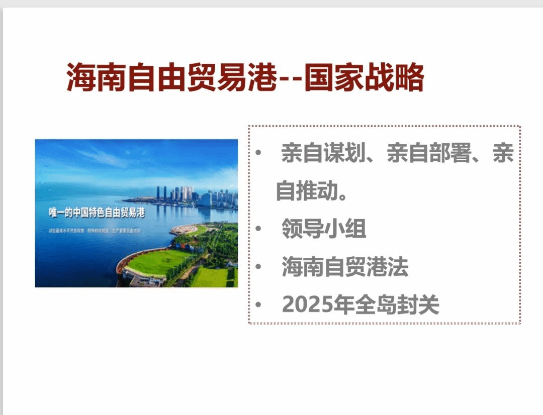首先曹阳老师说明海南自贸港是国家战略,海南是中国内地唯一的自由贸易港,也是习近平主席亲自谋划、亲自部署、亲自推动的改革开放重大举措。近年来,海南对标世界最高水平开放形态,加快建设具有世界影响力的中国特色自由贸易港,推动自由贸易港建设进入准备封关运作的关键阶段。