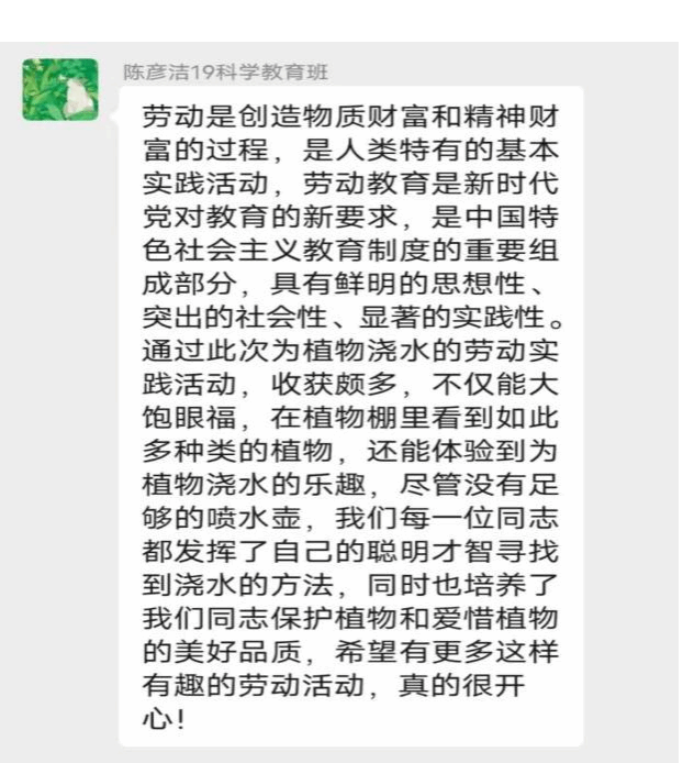 陈彦洁同志表示,劳动是创造物质财富和精神财富的过程,是人类特有的基本实践活动,劳动教育是新时代党对教育的新要求。通过此次为植物浇水的劳动实践活动,收获颇多,不仅能大饱眼福,在植物棚里看到如此多种类的植物,还能体验到为植物浇水的乐趣,尽管没有足够的喷水壶,但每一位同志都发挥了自己的聪明才智寻找到浇水的方法,同时也培养了大家保护植物和爱惜植物的美好品质,希望之后有更多这样有趣的劳动活动!