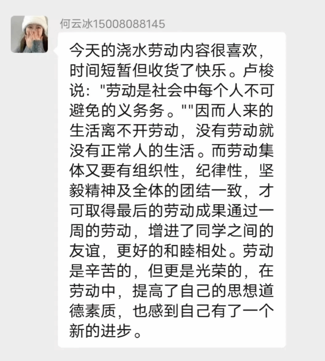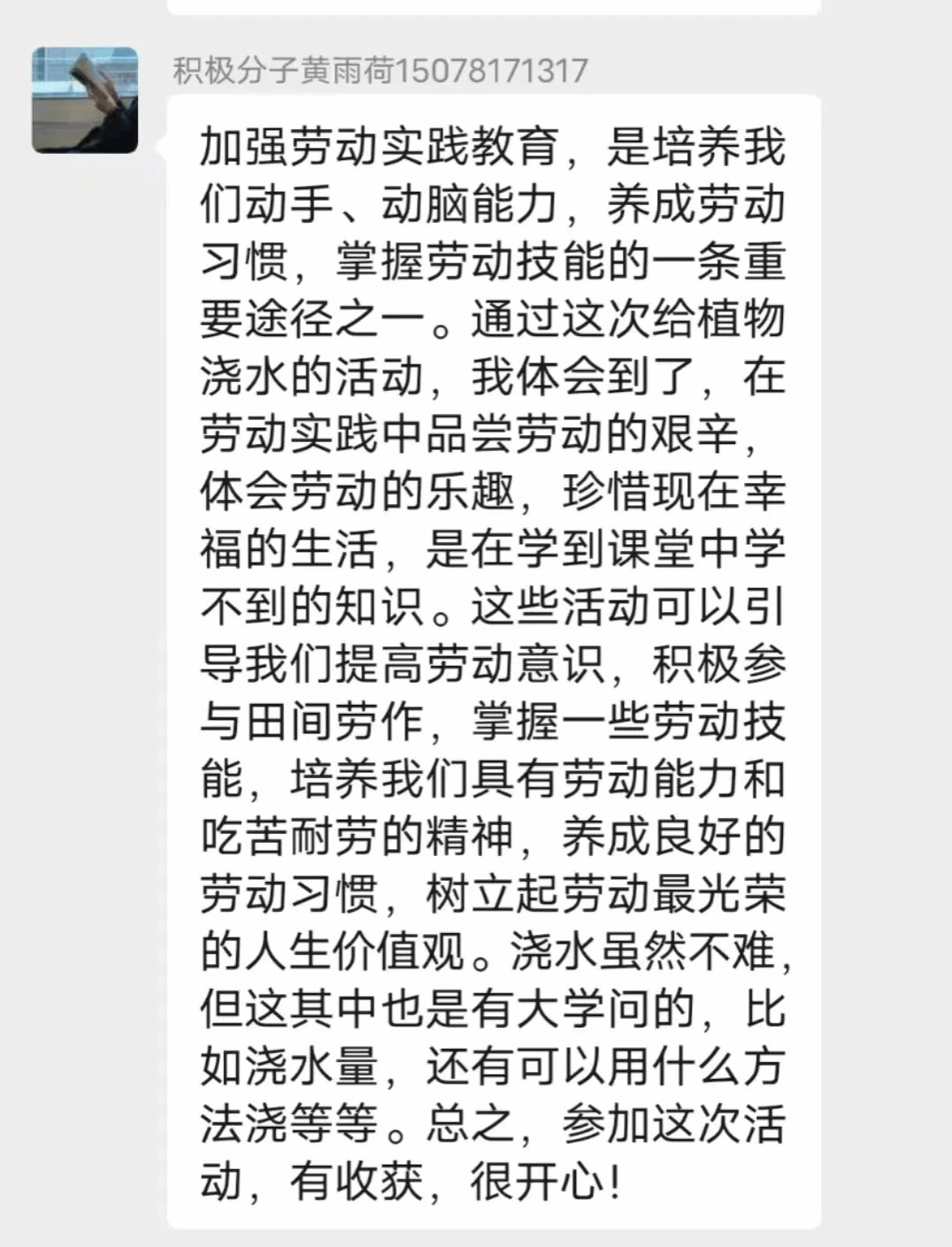孙俊陶同学表示,生命在于绿色,希望在于绿色。我们的校园,每一个角落都洋溢着绿色,焕发着勃勃的生机和青春的活力。作为一名积极分子,维护校园环境是责任,今天参与的浇水活动,不仅仅付诸实践,还认识到马克思主义提及的实践性的重要性,要将劳动渗透于各个方面,希望以后能多参加此类活动,从身边的小事做起,服务于校园,服务于人民!