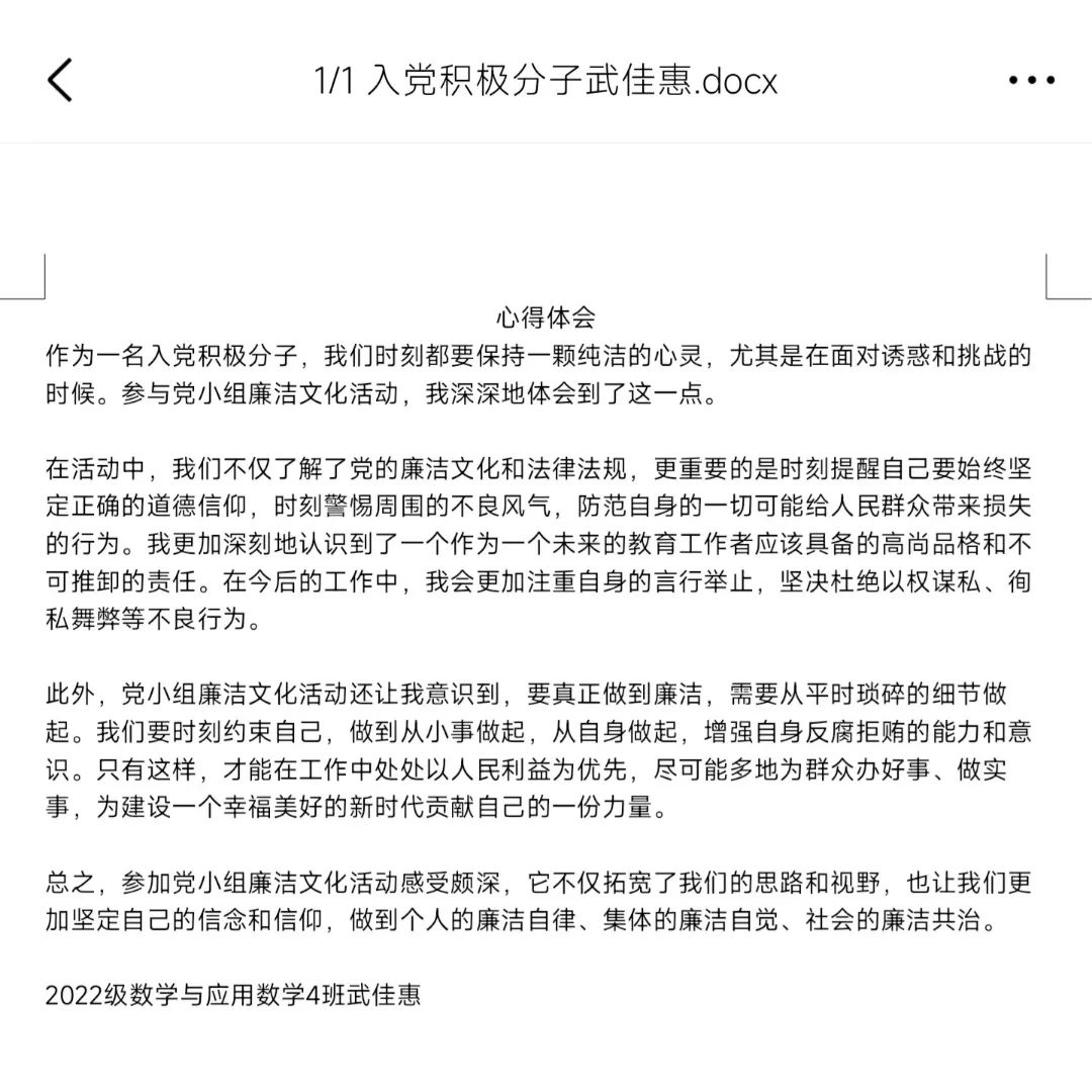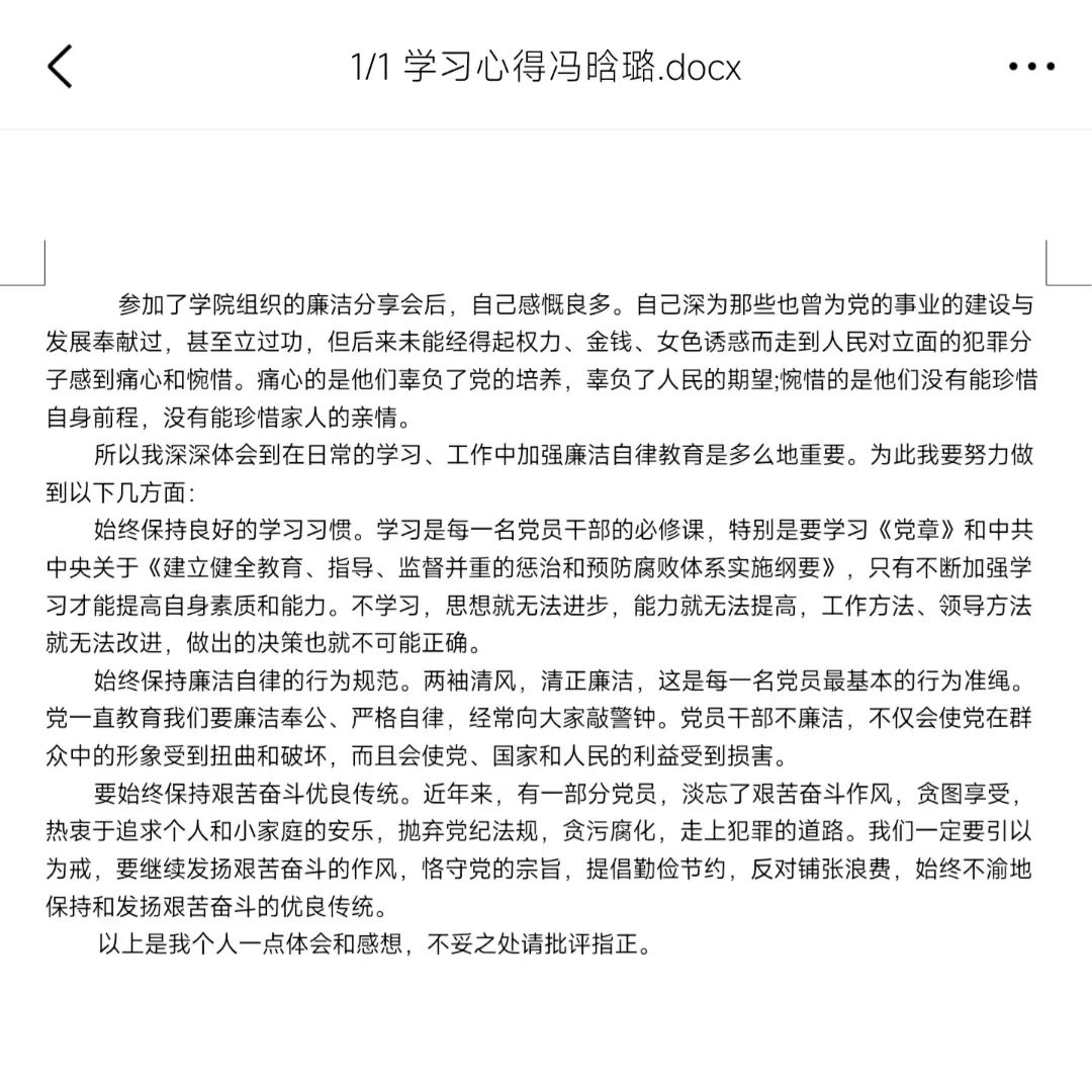 武佳惠同学表示,要真正做到廉洁,需要从平时琐碎的细节做起。我们要时刻约束自己,做到从小事做起,从自身做起,增强自身反腐拒贿的能力和意识。只有这样,才能在工作中处处以人民利益为优先,尽可能多地为群众办好事、做实事,为建设一个幸福美好的新时代贡献自己的一份力量。