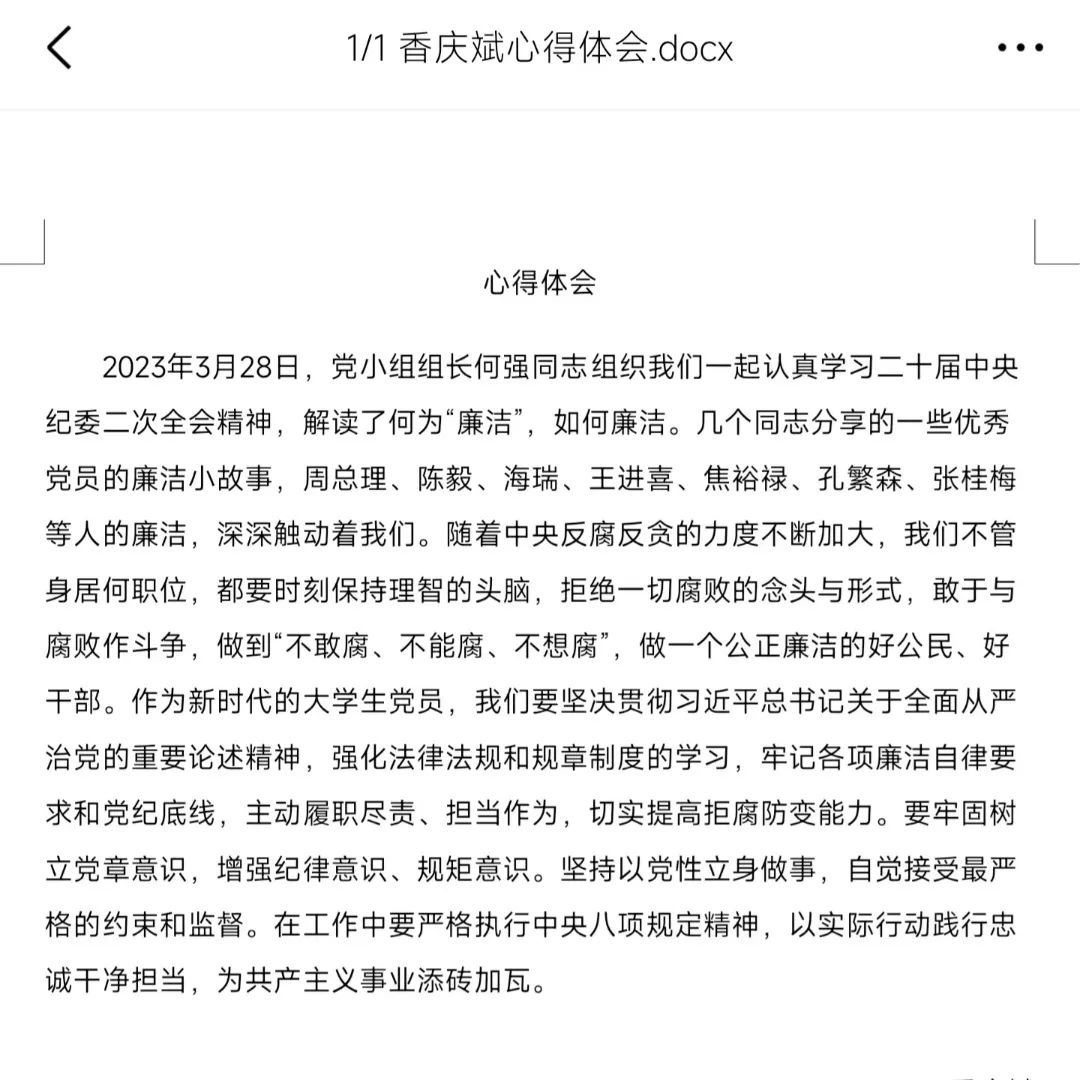 香庆斌同志表示,作为新时代的大学生党员,我们要坚决贯彻习近平总书记关于全面从严治党的重要论述精神,强化法律法规和规章制度的学习,牢记各项廉洁自律要求和党纪底线,主动履职尽责、担当作为,切实提高拒腐防变能力。要牢固树立党章意识,增强纪律意识、规矩意识。坚持以党性立身做事,自觉接受最严格的约束和监督。