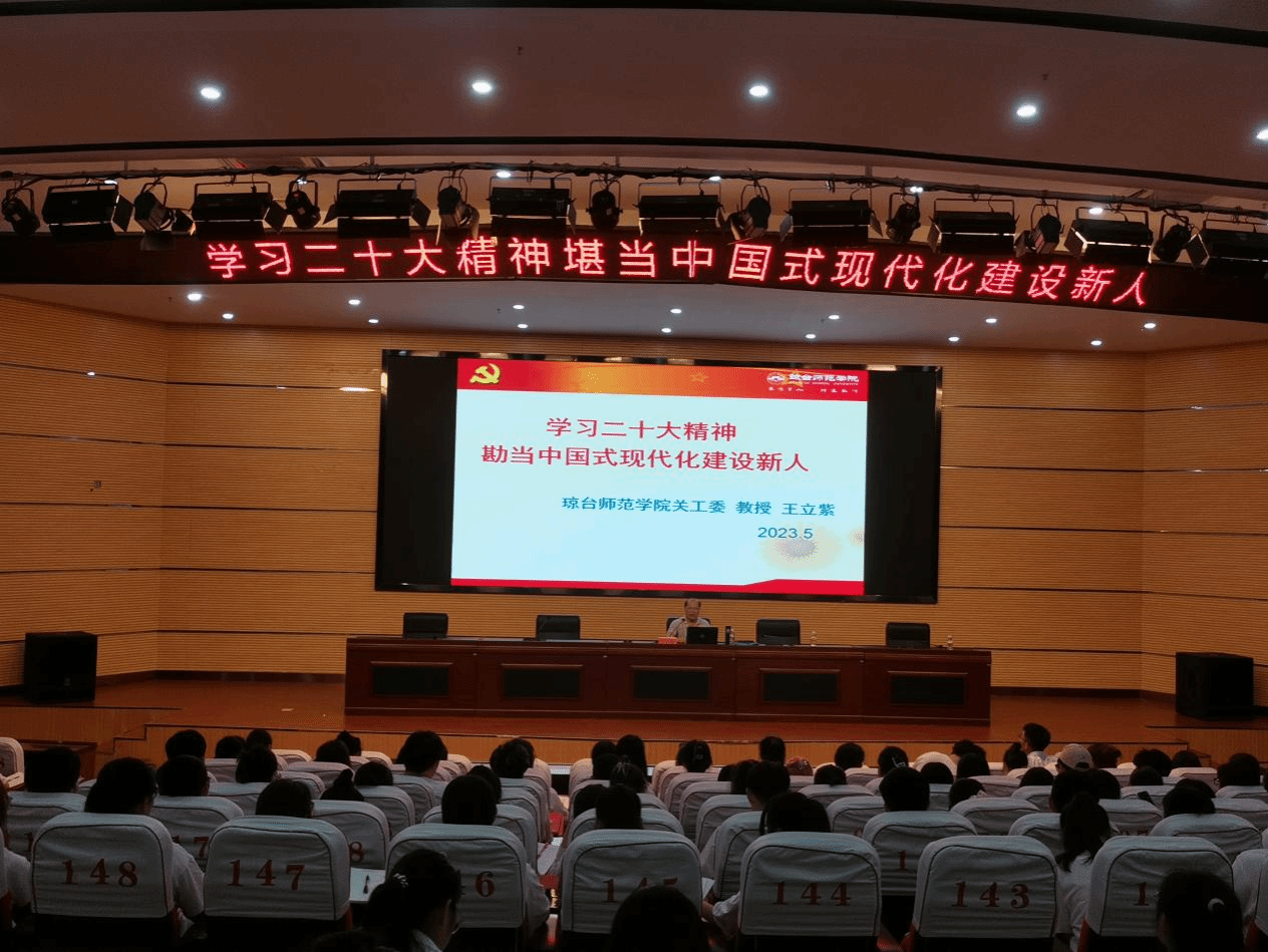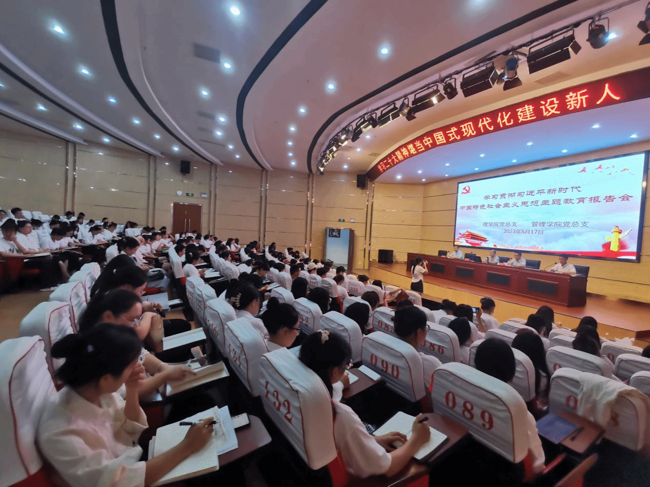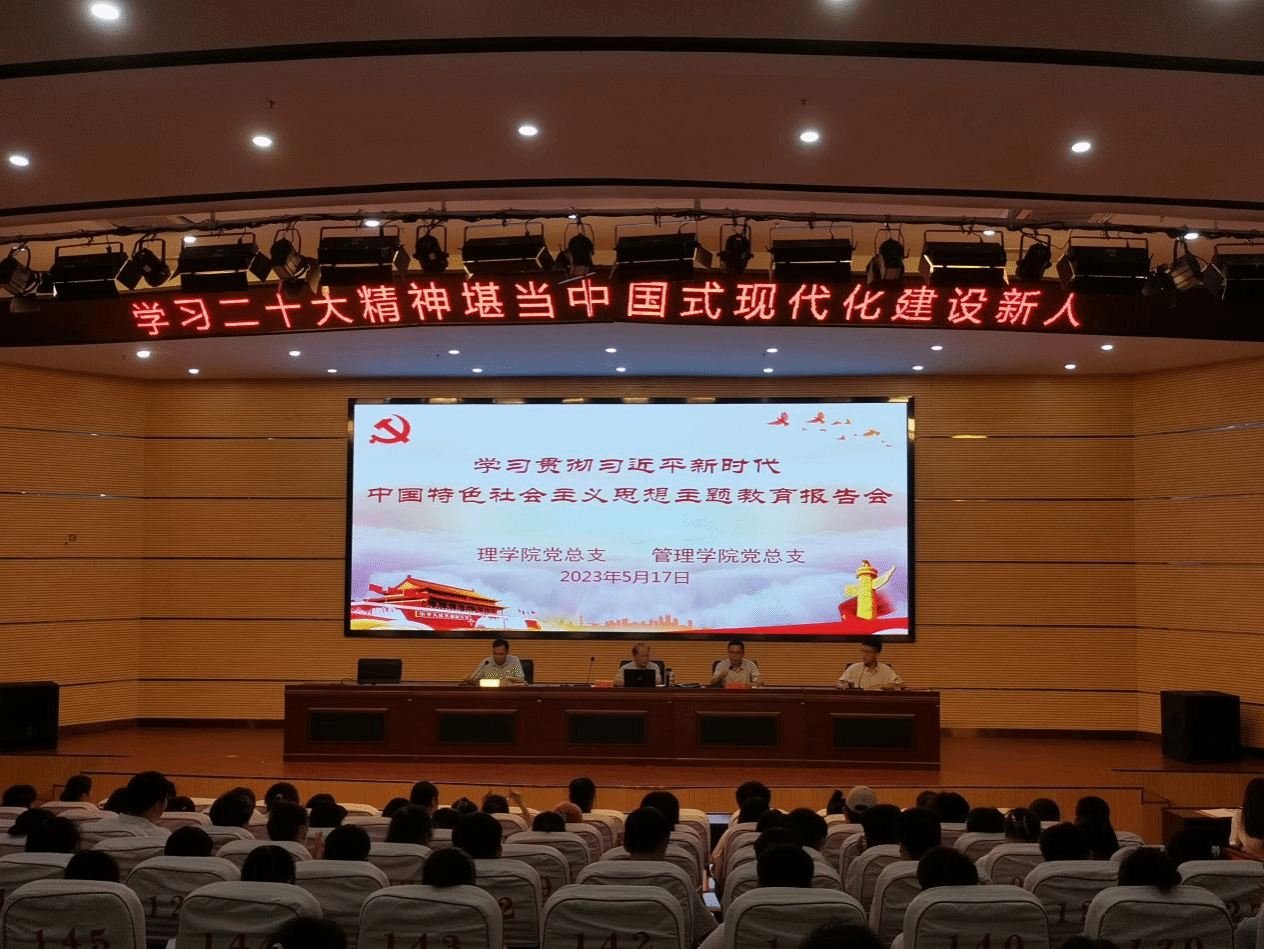 2023年5月17日晚上7点,太阳成集团122ccvip党总支、管太阳成集团122ccvip党总支在图书馆报告厅联合开展学习贯彻习近平新时代中国特色社会主义思想主题教育报告会,邀请校党建组织员、关工委副主任王立紫同志为两个学院的学生党员、入党积极分子共204人作了题为《学习党的二十大精神堪当中国式现代化建设新人》的报告。劳文格、颜松海两位学院总支书记出席并作了讲话。