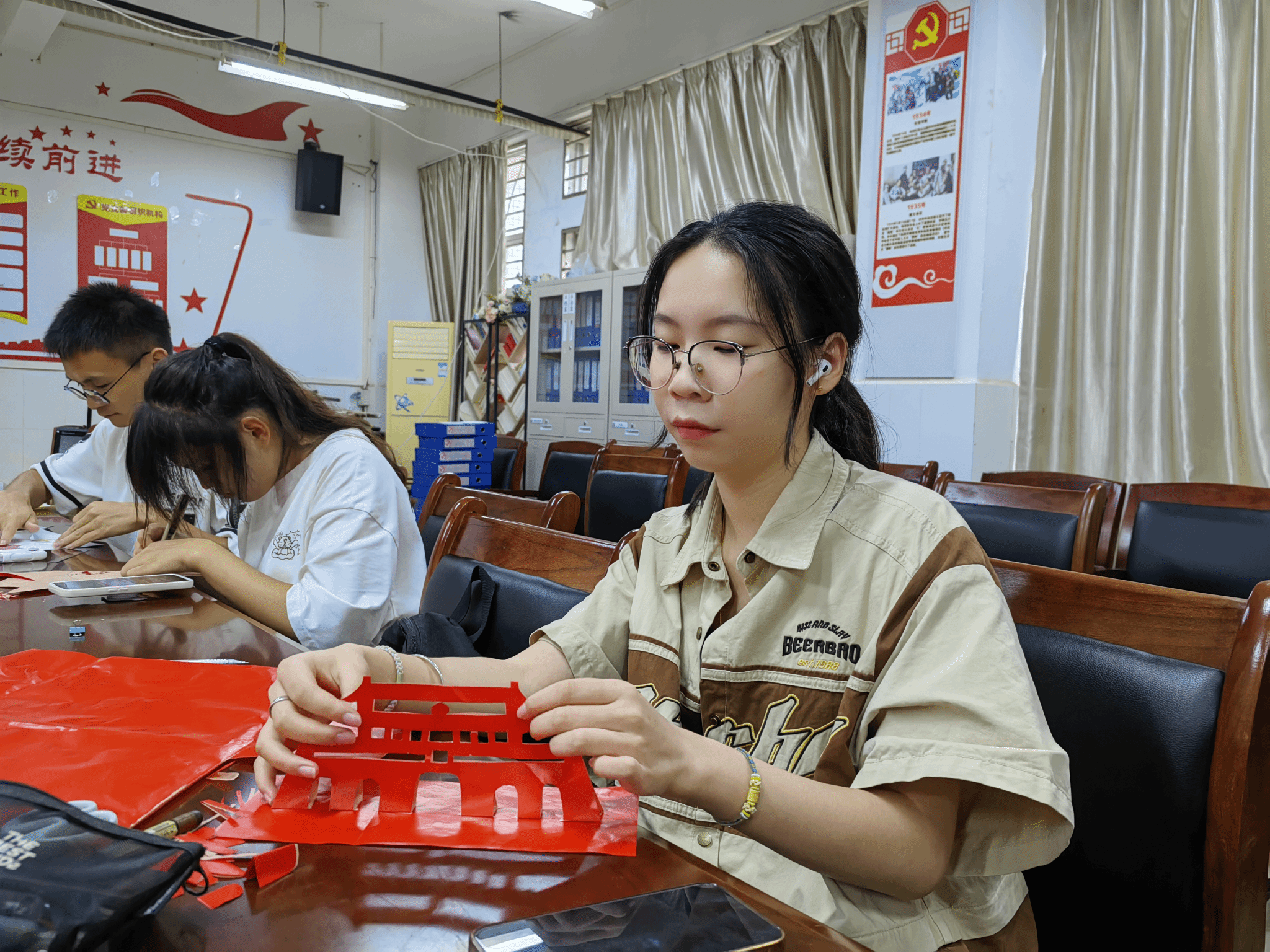在活动现场,同学们跃跃欲试,以纸为台,剪刀为笔,将党的历史、人物、事件、口号等融入剪纸作品之中。一幅幅生动逼真的剪纸作品,既是青年们对党的热爱与敬仰的体现,也是他们表达对党的历史和精神的理解与感悟的方式。同学们在互帮互助下,亲自动手创作,感受剪纸艺术的魅力,体验民间艺术的独特之处。