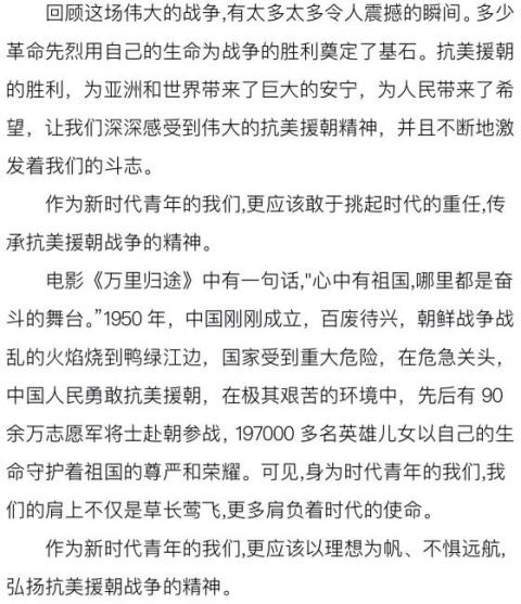 青年者如日出之朝阳,作为新青年的我们是国家未来发展的希望,我们更应传承发扬伟大的抗美援朝精神,让精神成为我们前进坚实的后盾和强大的力量。让我们铭记历史,牢记先辈教诲,传承抗美援朝精神,建设富强明主文明和谐美丽的现代化强国。