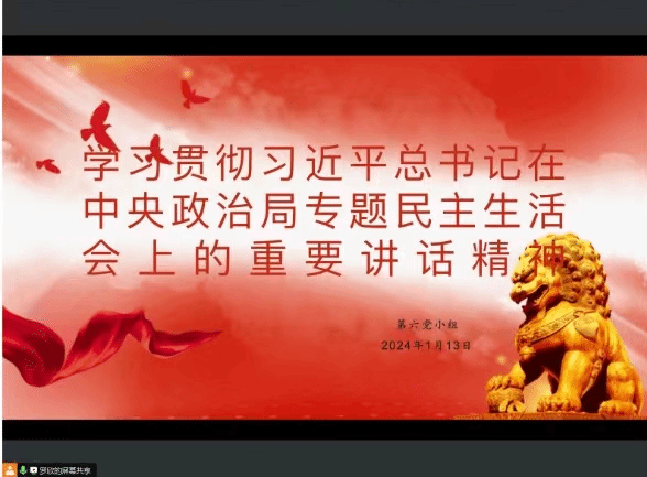 2024年1月14日,太阳成集团122ccvip学生党支部线上开展“学习贯彻习近平总书记在中央政治局专题民主生活会上的重要讲话精神”主题党日活动。此次活动旨在让同志们深入学习贯彻习近平总书记在中央政治局专题民主生活会上的重要讲话精神,弘扬伟大建党精神、坚持党的百年奋斗历史经验、不忘初心使命,勇于担当作为。