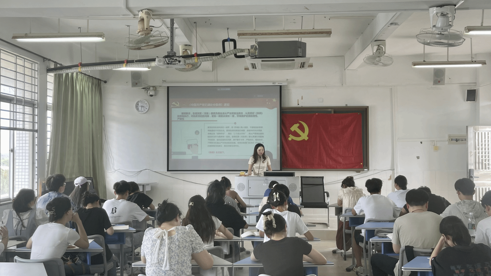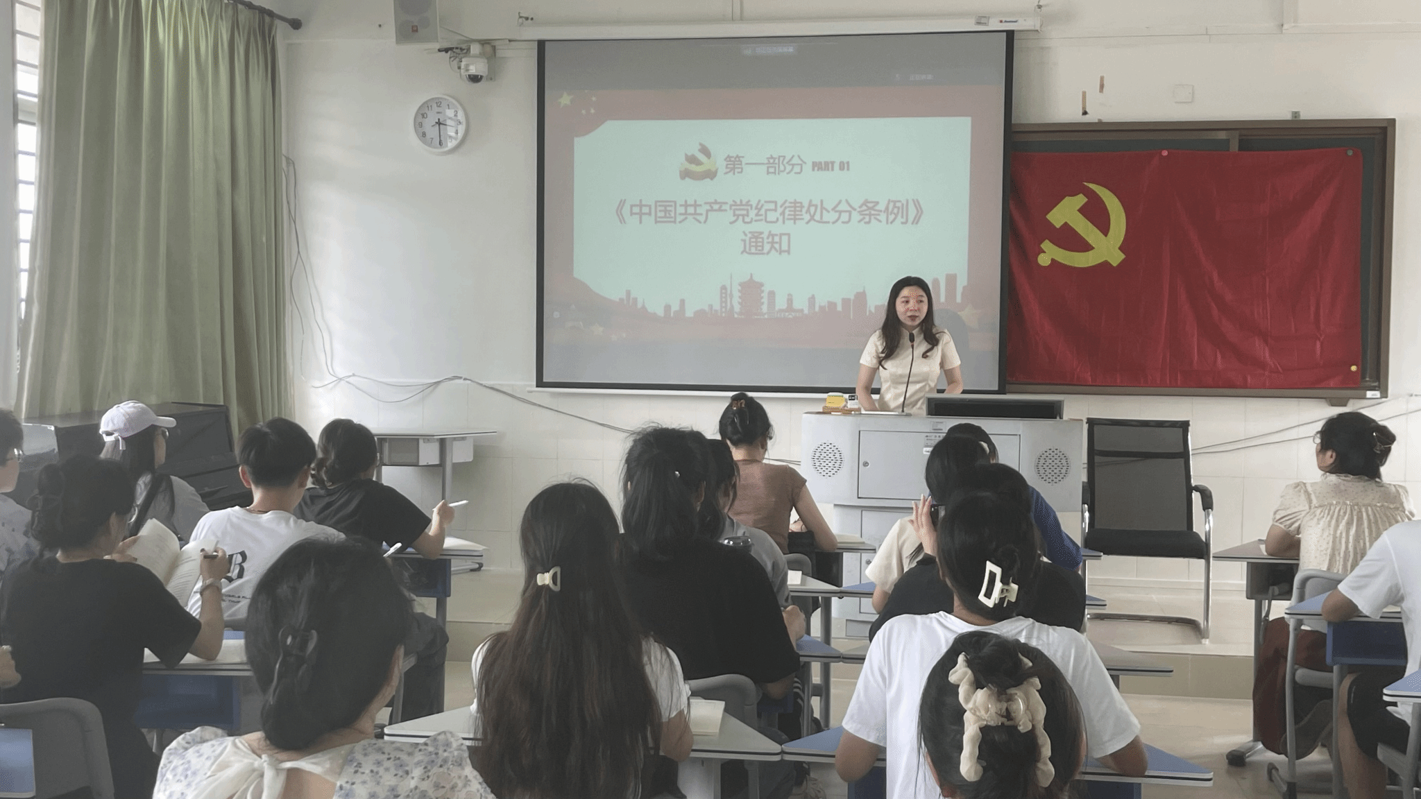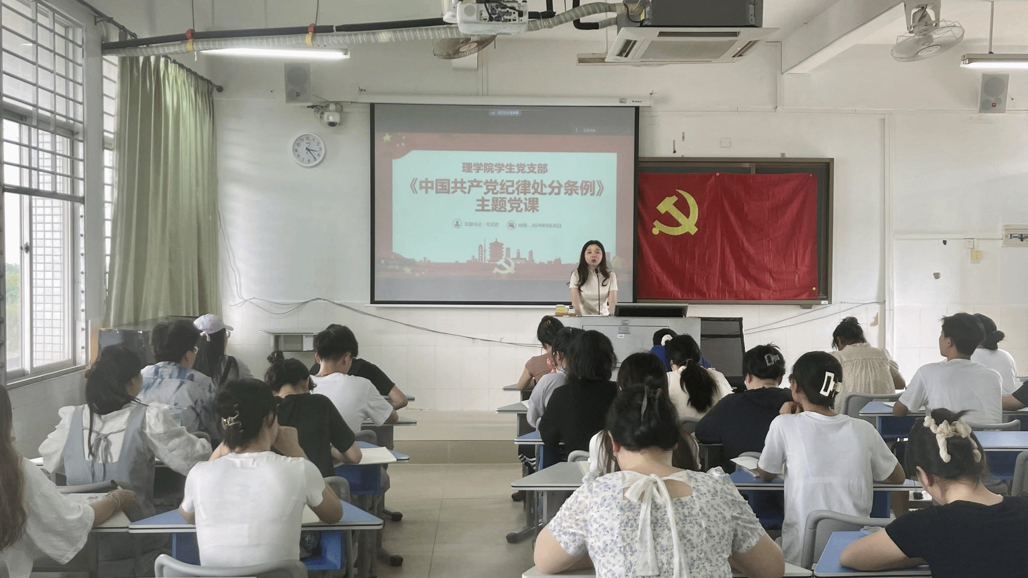 为扎实有效开展好党纪学习教育,深入学习贯彻《中国共产党纪律处分条例》,引导全体党员树牢责任意识、底线意识、纪律意识。2024年4月26日下午,由支部书记毛文迈同志讲授的《中国共产党纪律处分条例》主题党课在实验楼B504举行。本次党课共有以下五个议程: