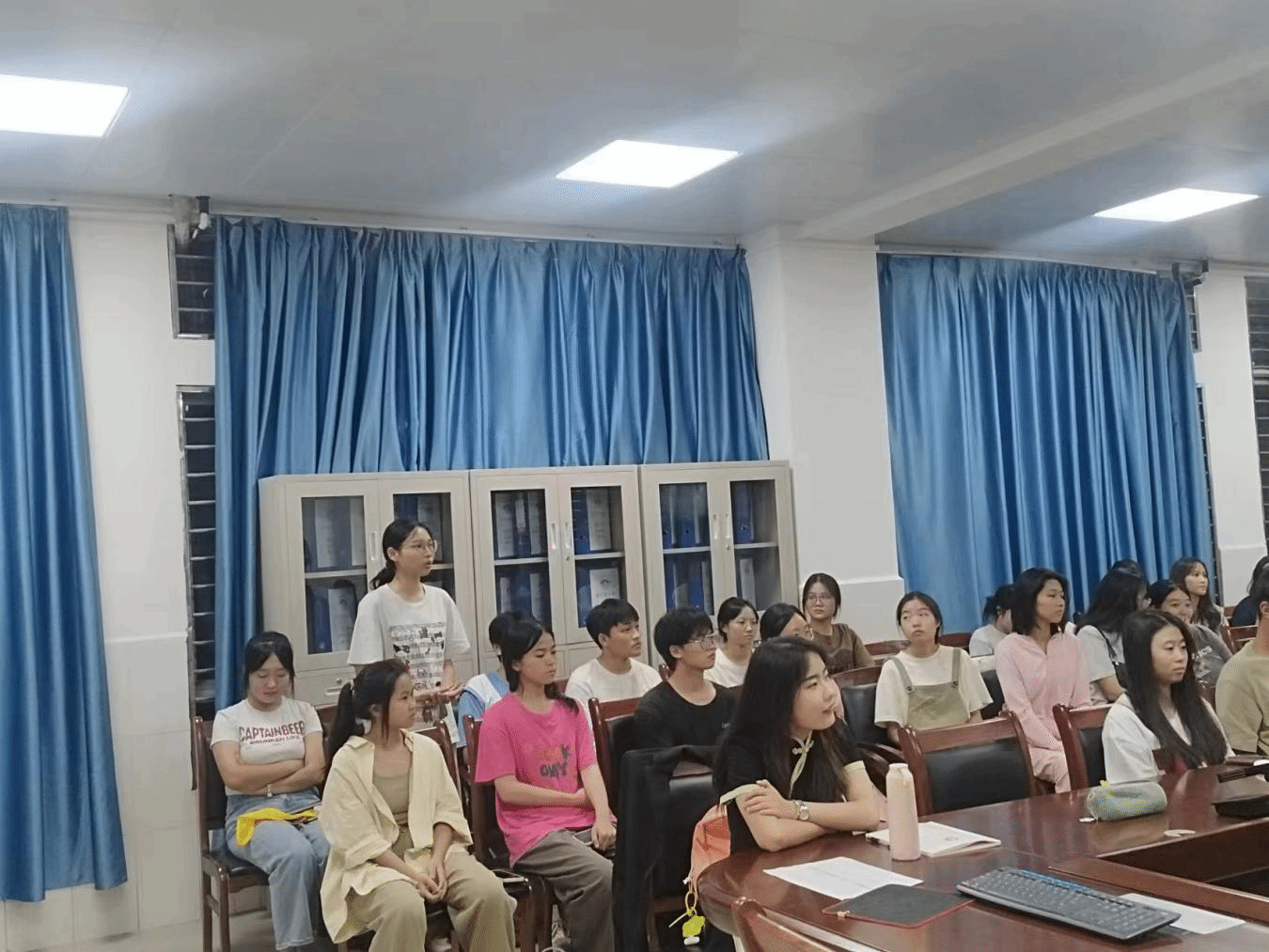 参会的同志们听得十分投入,并向两位分享经验的同志提出了问题。方诗语同志向周昭均同志提问:在创客大赛中,前期应该做哪些准备和后期的发展方向规划是什么?周昭均同志回答:前期需明确参赛主题,组建团队,进行相关知识学习与技能培训,准备好材料与工具。后期可考虑将成果商业化,或继续深入研发,拓展应用领域,还可通过参赛提升影响力,吸引合作与投资,推动项目进一步发展。