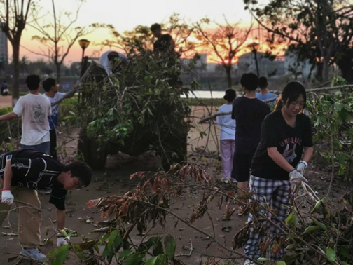 在老师们的指挥下,同志们通力配合,齐心协力,搬走被台风吹断的树木枝干,清理堆积的败叶和杂物。在美丽的夕阳下,同志们辛勤劳动,看着渐渐变得整洁的环境,同志们真正体会到劳动之美。
