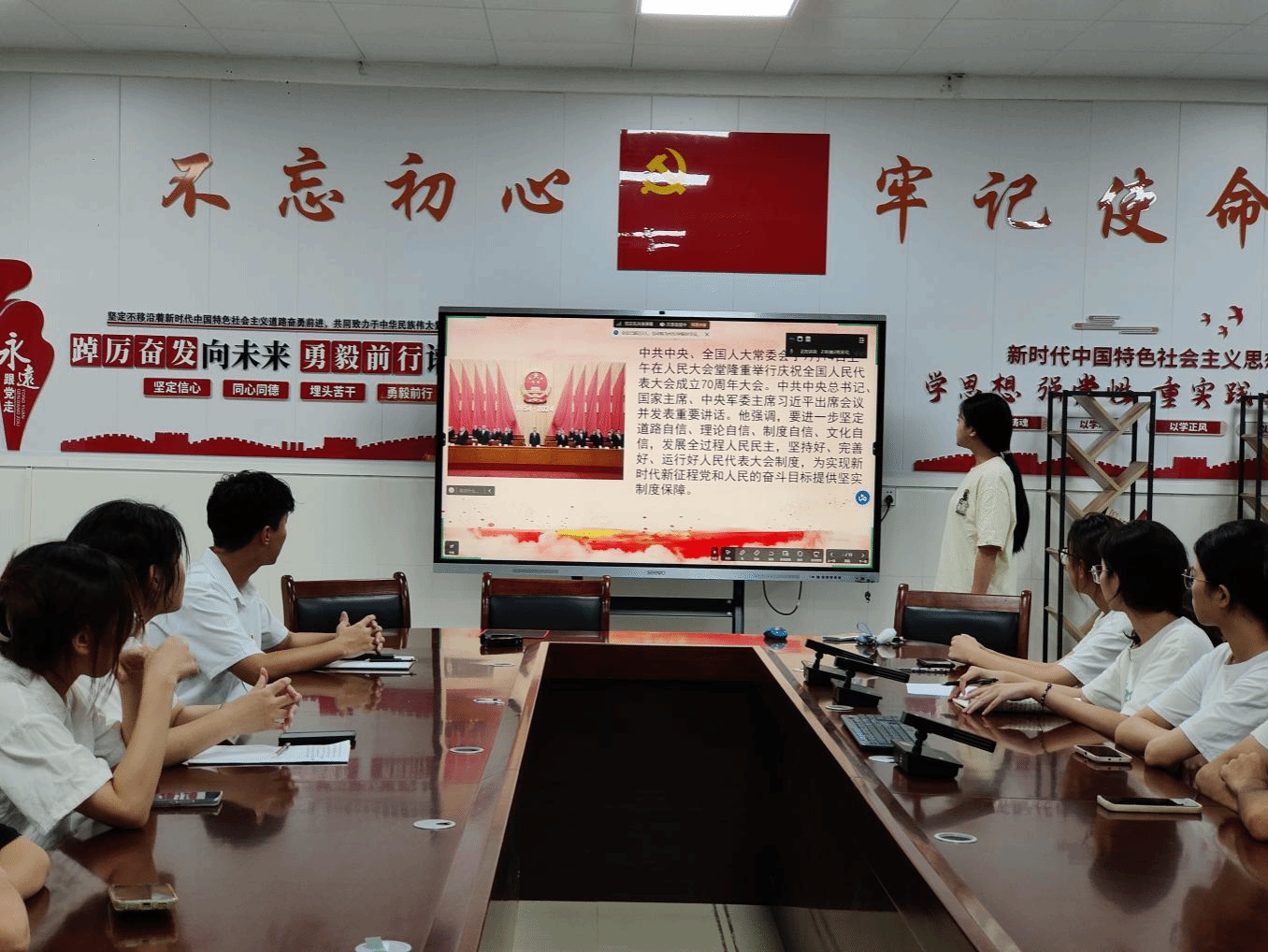首先,主持人王沁萤同志向大家简单介了习近平在庆祝全国人民代表大会成立70周年大会上发表的重要讲话的主要内容。