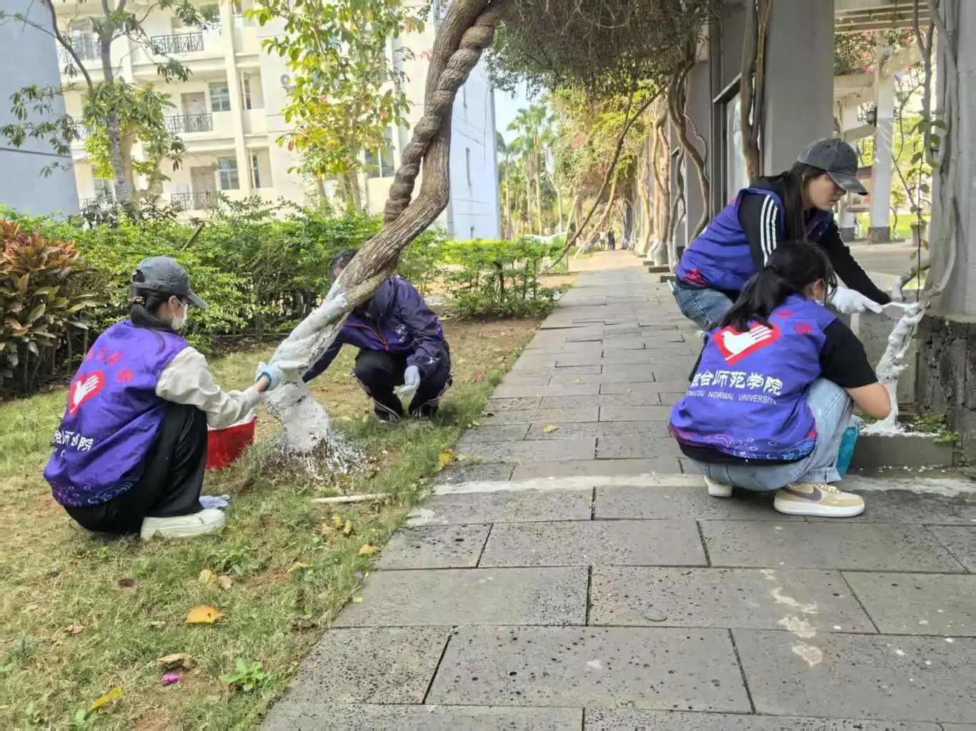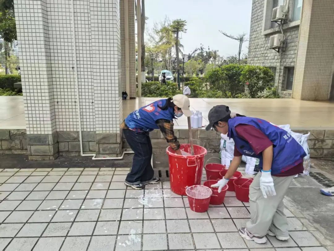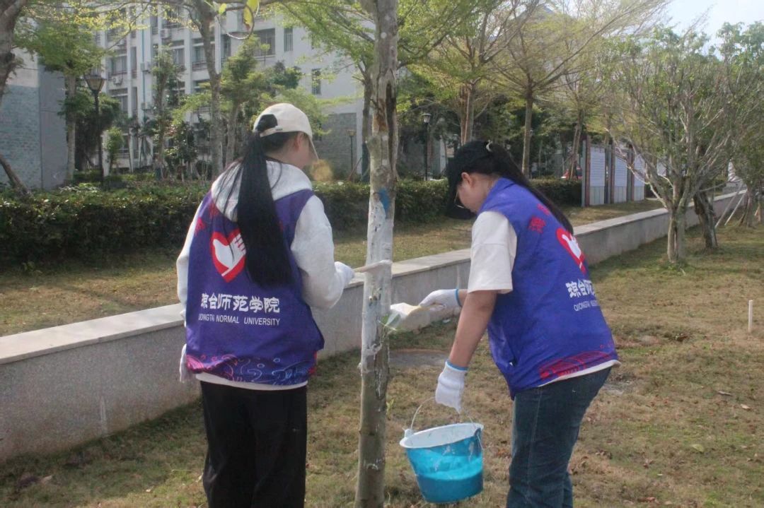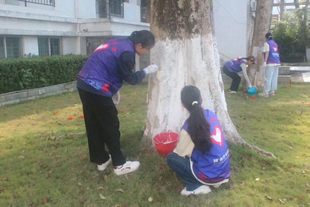 活动期间,志愿者们两人一组或是多人一队,拎着桶、拿着刷子,带着准备好的石灰,满怀热忱地奔赴指定区域,迅速投入工作,他们有的蹲下身子,有的微微弯腰,稳稳握住刷子,从树根底部开始,缓慢而专注地向上涂抹,不放过任何一处,用实际行动诠释着对树木的呵护。