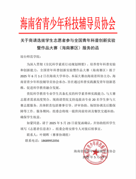 2025年6月2日,第十一届全国青年科普创新实验暨作品大赛(海南赛区)于海南大学盛大启幕。本次赛事聚焦科普创新实践,吸引众多青年才俊同台竞技。应海南省青少年科技辅导员协会诚挚邀请,我院科学教育专业遴选20名品学兼优的学子,以专业素养与奉献精神投身赛事志愿服务工作,全力保障大赛有序开展。