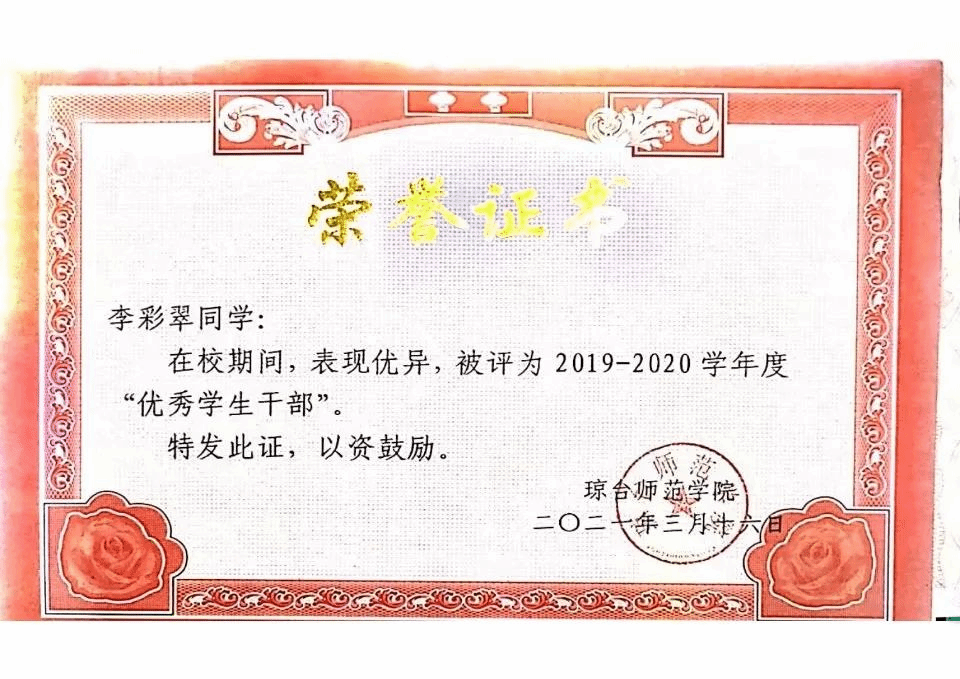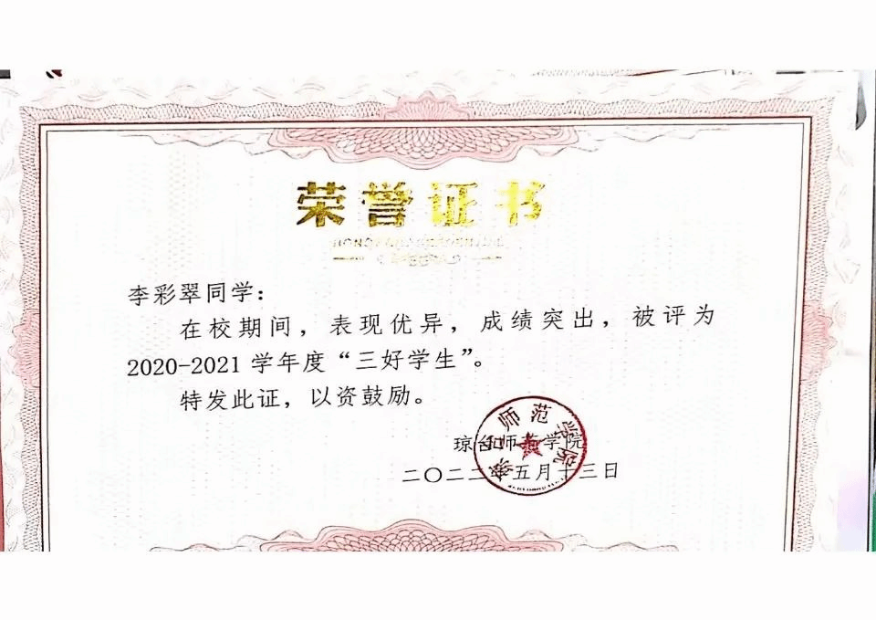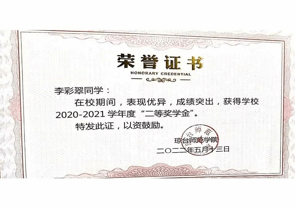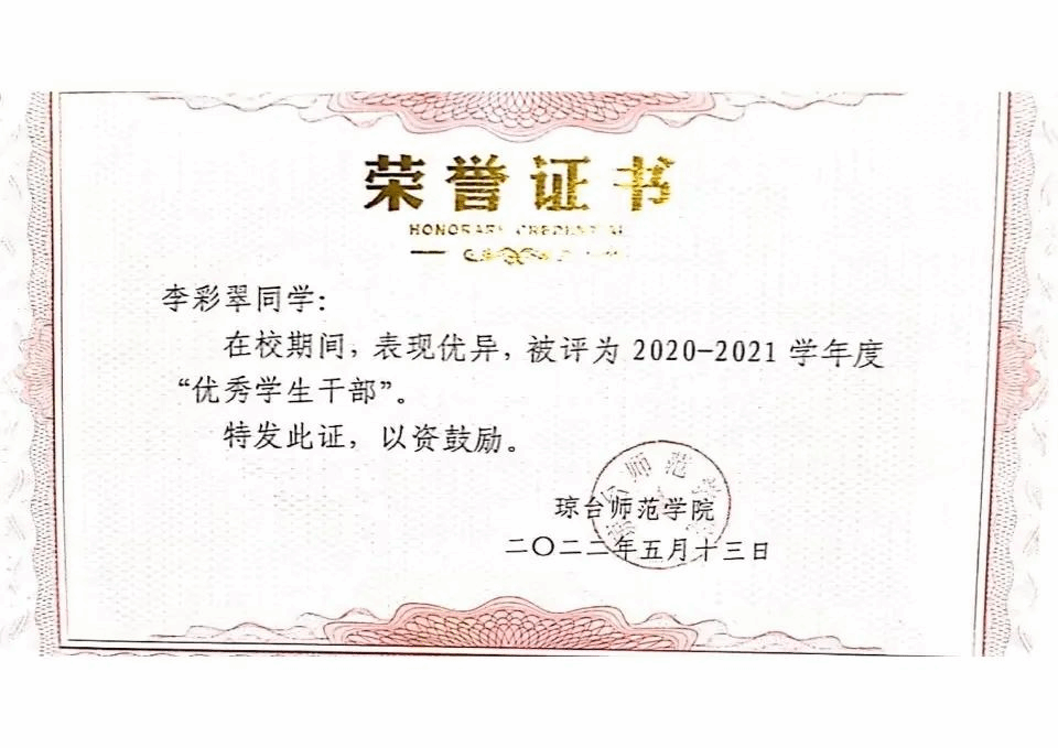 刘禹锡有言:“以不息为体,以日新为道。”既把勤奋不息当作根本,把每天取得进步特别努力的方向。在大学期间,李彩翠同学积极对待每一门课程,并取得了优异的学习成绩,曾获得2020-2021年度“三好学生”、2020-2021年度“二等奖学金”,2021-2022年度“三好学生”2021-2022年度“一等奖学金”、太阳成集团122ccvip第十三届“挑战杯”大赛初选二等奖、中美青年创客大赛海口分赛区选拔赛二等奖等多项荣誉。