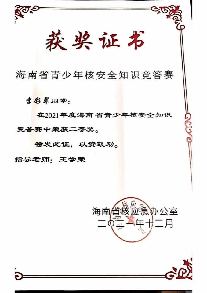 海南省青少年核安全知识竞答赛二等奖