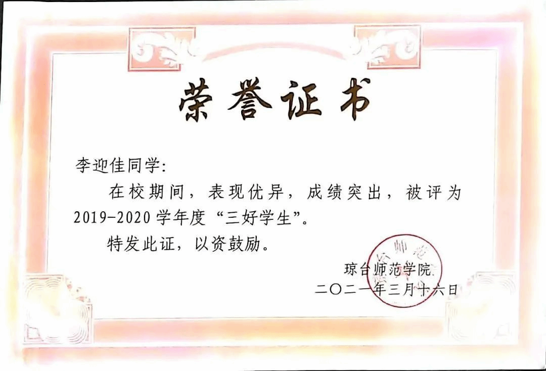 “学生工作于我而言不仅是一份责任,更是一份情怀。”大学里,李迎佳同学先后担任琼台师范学院校级学生会秘书处干事、综合管理部副部长。她自己也记不清自己曾在行政楼加了多少个班,也记不清见证过多少次琼台的日出。她只记得行政楼106的地板很凉,需要多垫两层塑料才能睡的舒坦;记得彻夜响个不停的打印机,总担心它明天就罢工;记得键盘的敲击声,一个文档没保存能让一个部门急的上火。也记得举办周末舞会时担心没人上台在前面尬跳的窘迫;记得举办游园会时看见同学兑奖时扬起笑脸的满足;记得举办元旦晚会时直播顺利结束的热泪盈眶。“原来我跟琼台的羁绊已经这么深了啊,这一路磕磕绊绊,但还是看见了繁花盛开。”