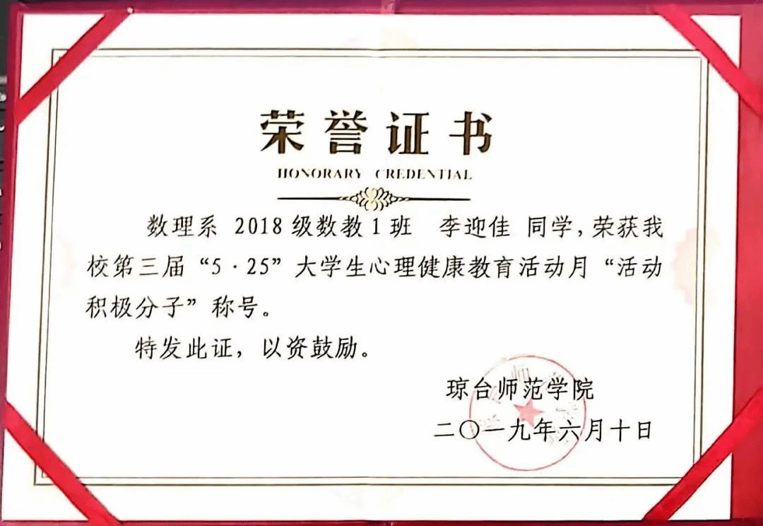 ·2019年度琼台师范学院“活动积极分子”称号
