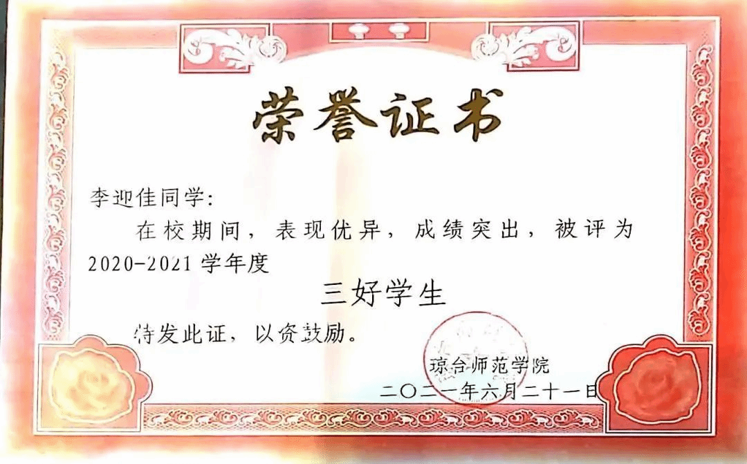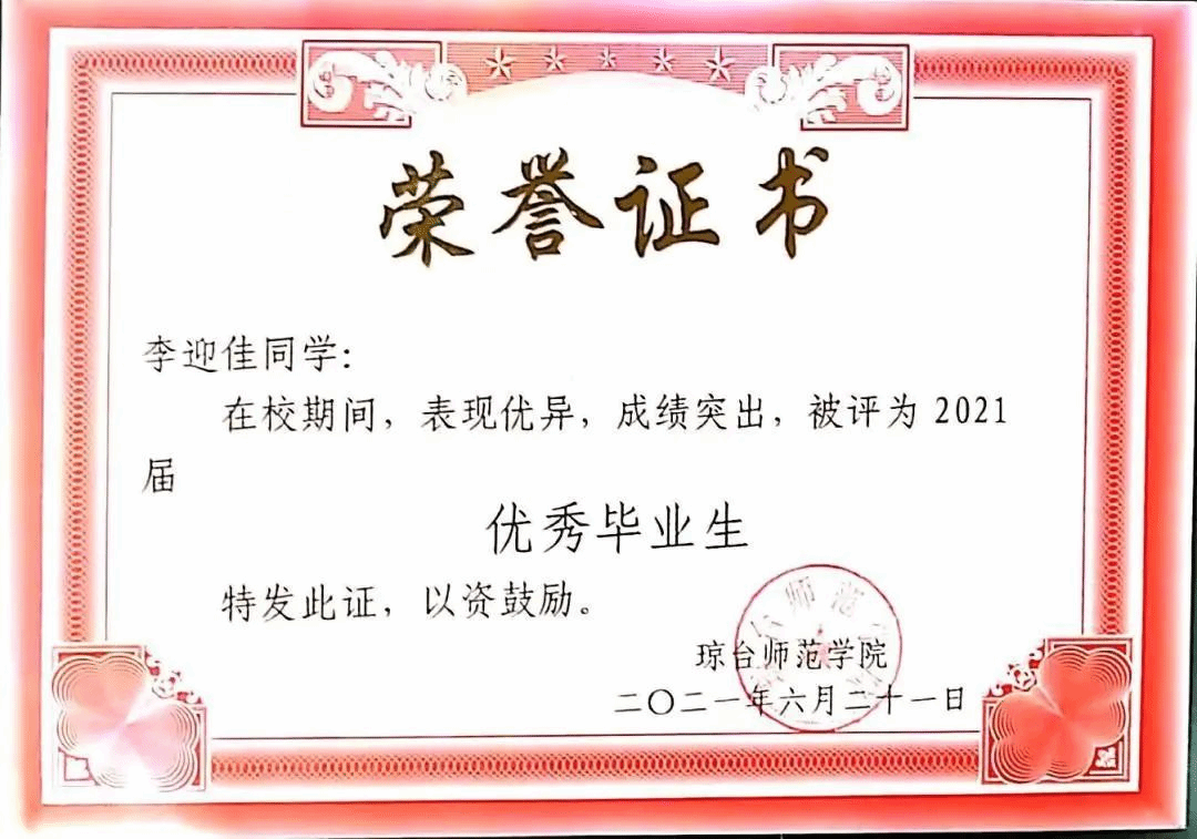 ·2021年6月 琼台师范学院评定为2021届“优秀毕业生”