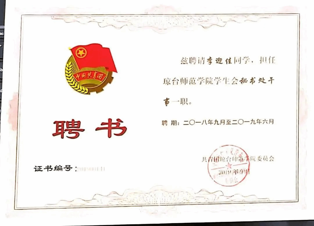 ·2019年度琼台师范学院“优秀共青团员”称号