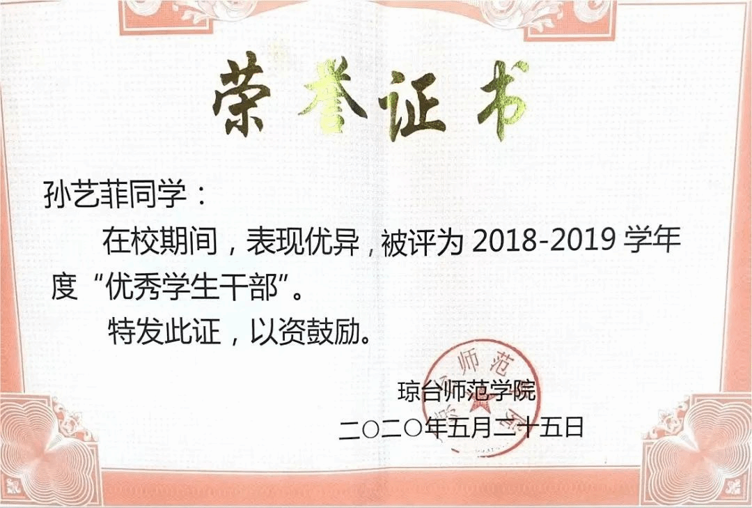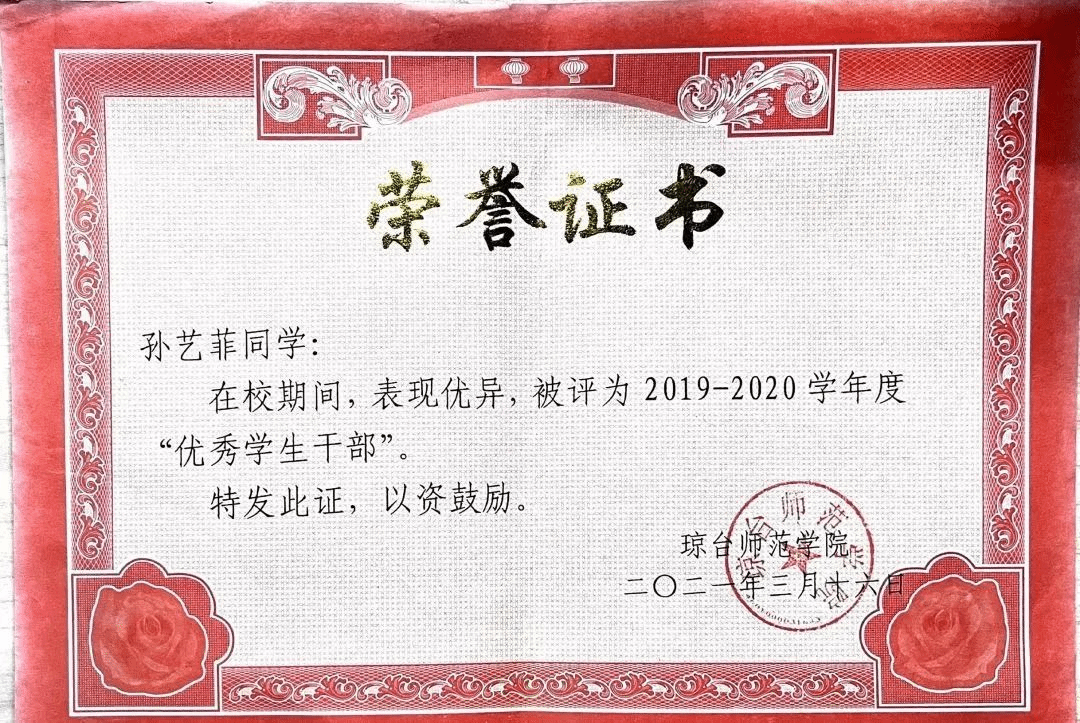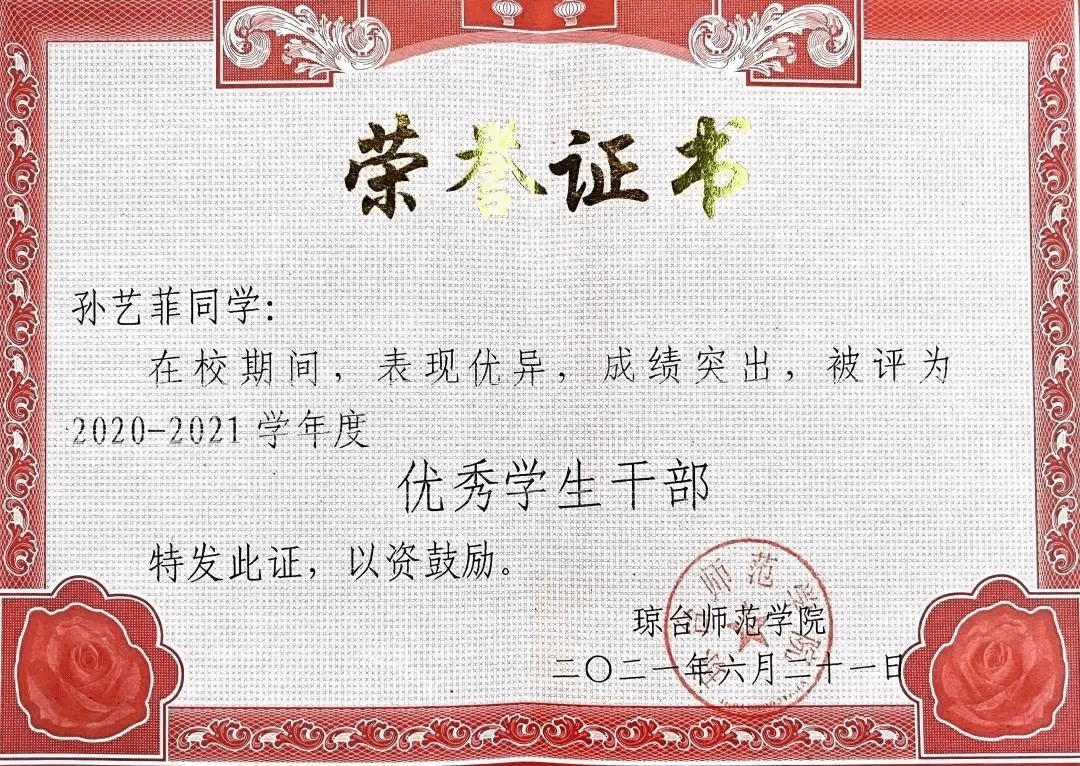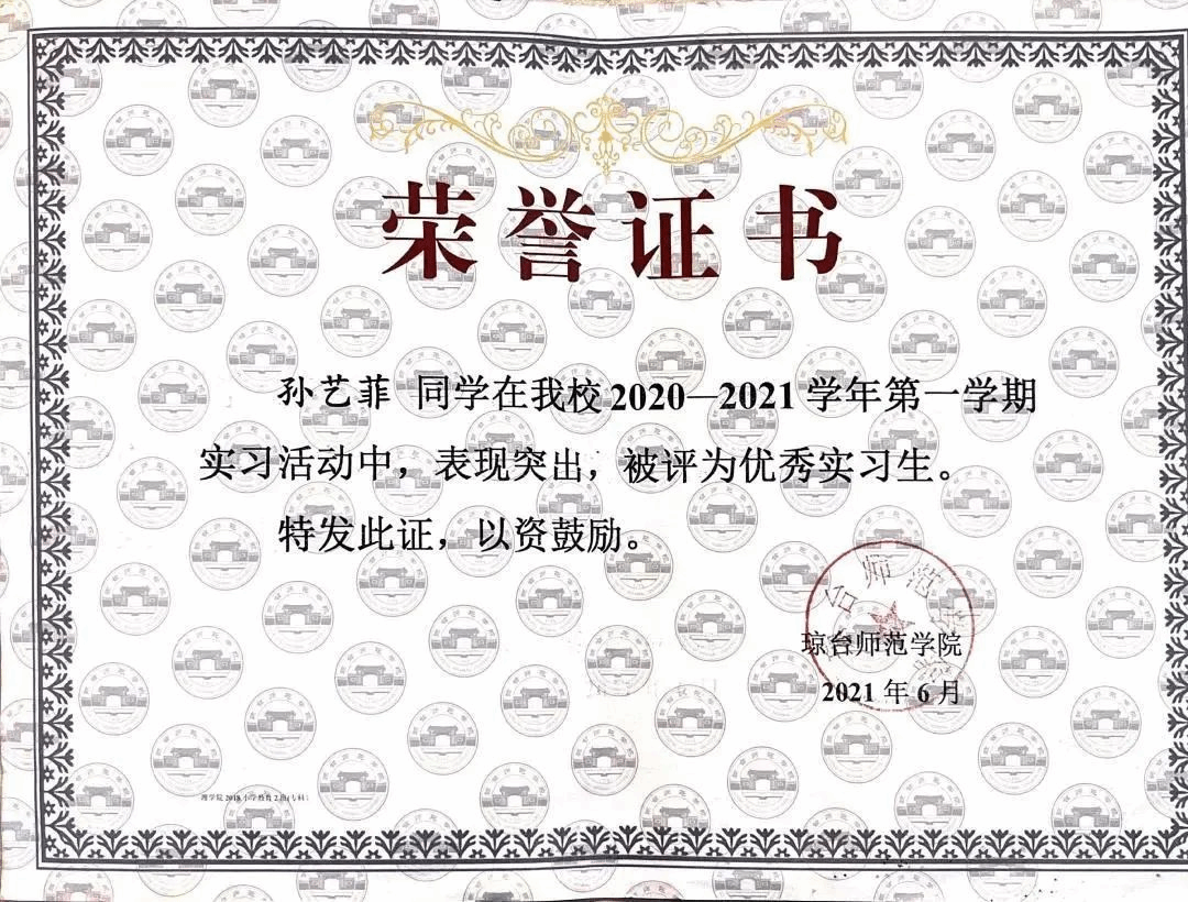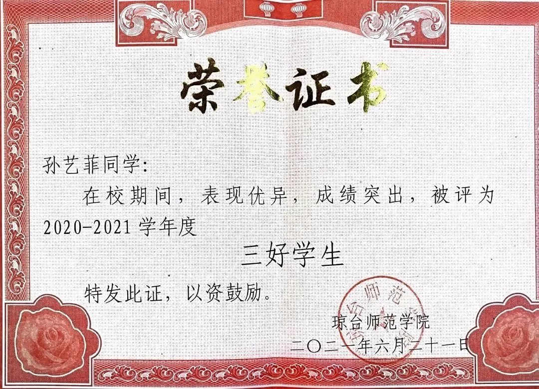 “学习的道路山高路远,有兴趣有机会,不妨尝试一下,哪怕不合适,即使撤退也不算输。”在学习上,孙艺菲同学不断刻苦钻研专业知识,加强理论知识的学习,成绩一直名列专业前茅。“纸上得来终觉浅,绝知此事要躬行”,她先后获得英语四级证书,计算机一级证书,普通话二级乙等证书,作为一名师范生,她曾荣获琼台师范学院“奎星杯”实习生技能大赛一等奖,琼台师范学院“外研社杯”写作大赛一等奖等荣誉称号,在这座充满活力的校园里,她留下了青春中沉甸甸的收获。凡心所向,素履可往,困难绊不住想要前进的脚步,压力消磨不了热爱,在五年的大学学习生涯中,她一苇以航。