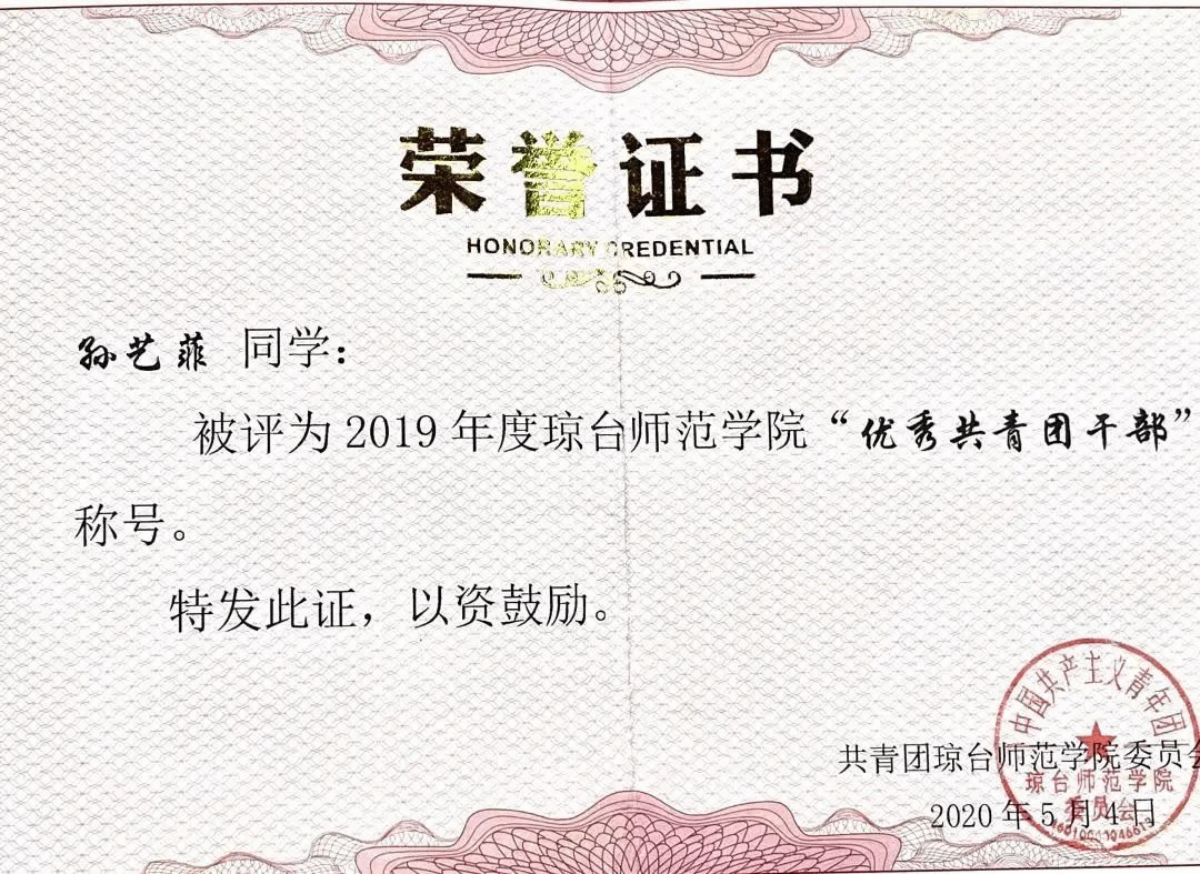 2019年度琼台师范学院“优秀共青团干部”称号
