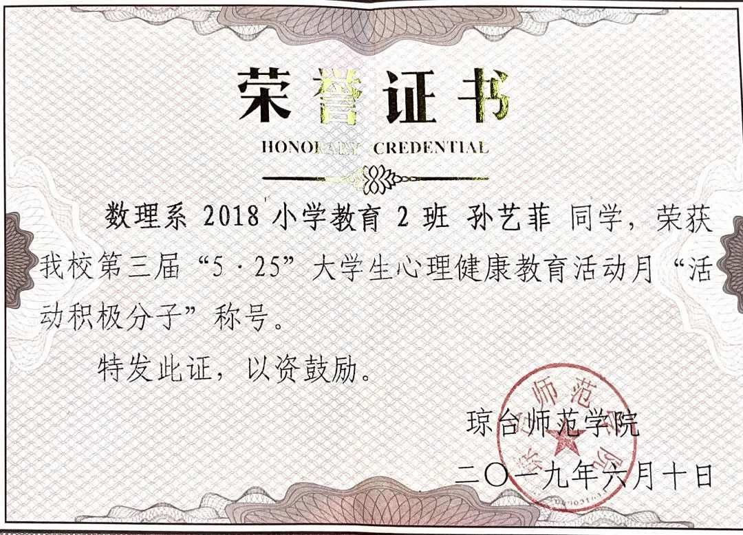 2019年荣获琼台师范学院“5.25”大学生心理健康教育活动月“活动积极分子”称号