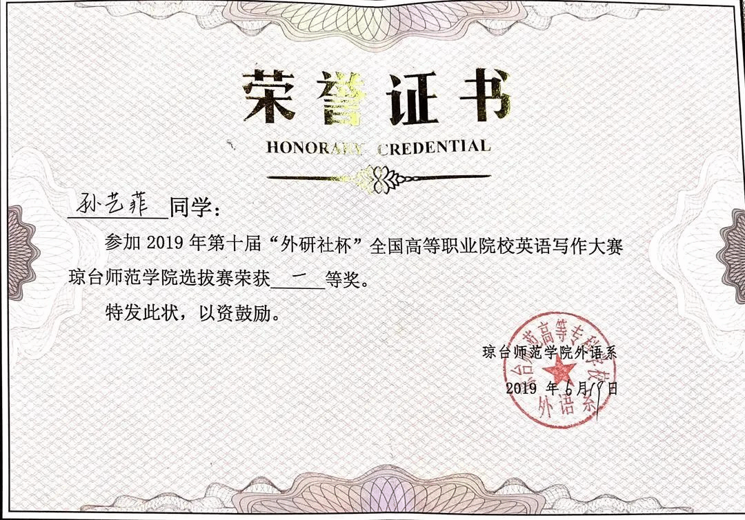 2019年荣获“外研社杯”全国高等职业院校英语写作大赛一等奖