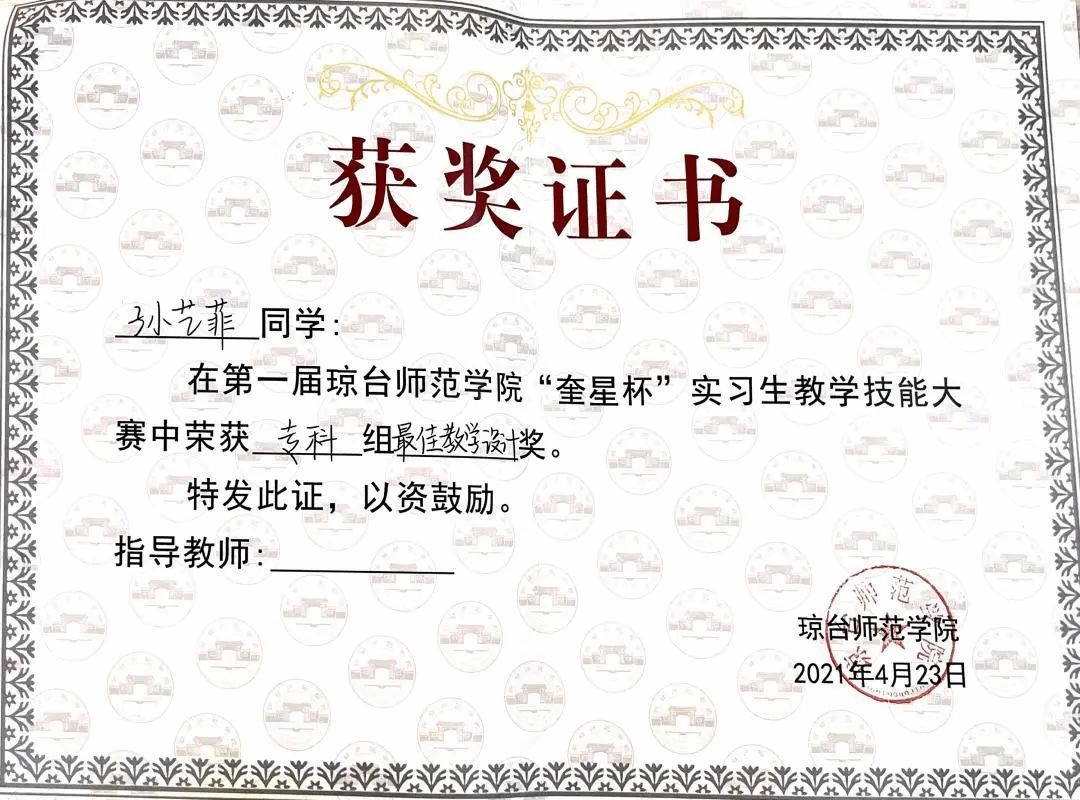 2021年荣获第一届琼台师范学院“奎星杯”实习生教学技能大赛最佳设计奖