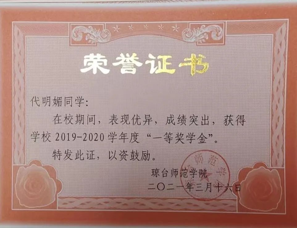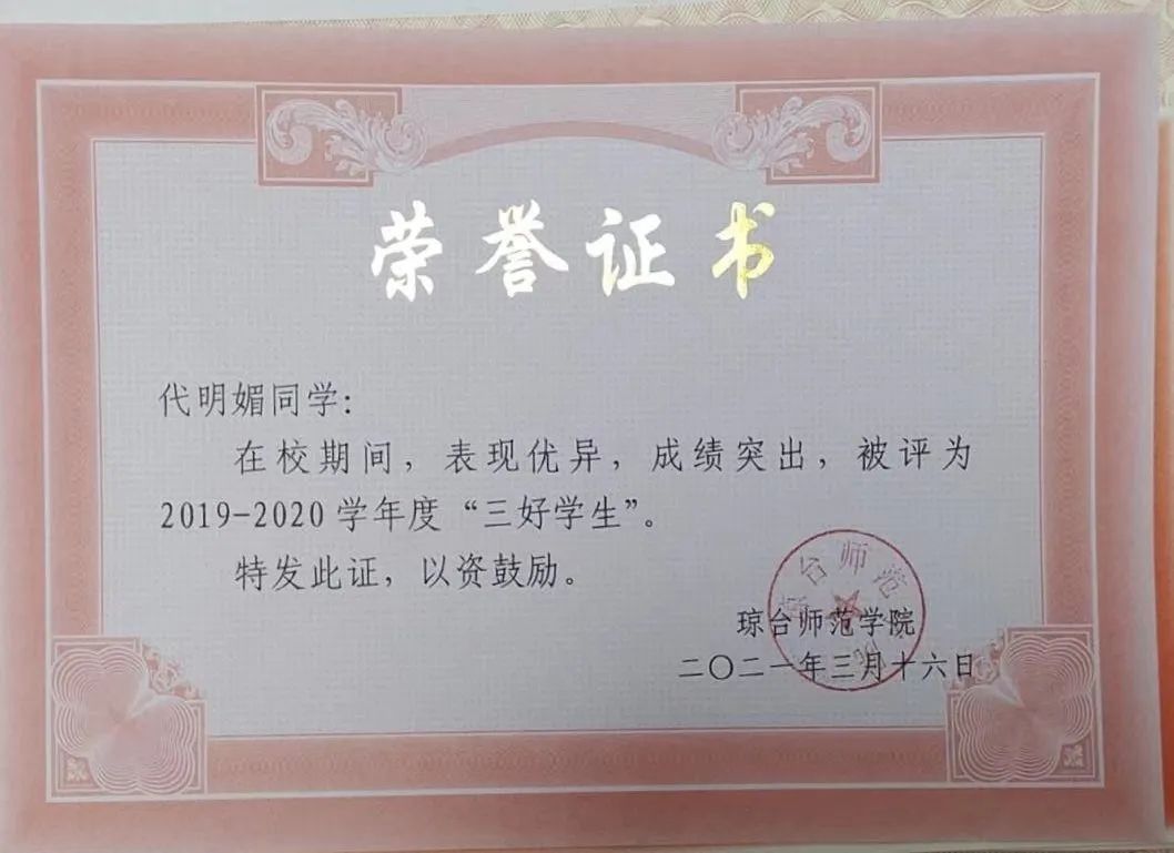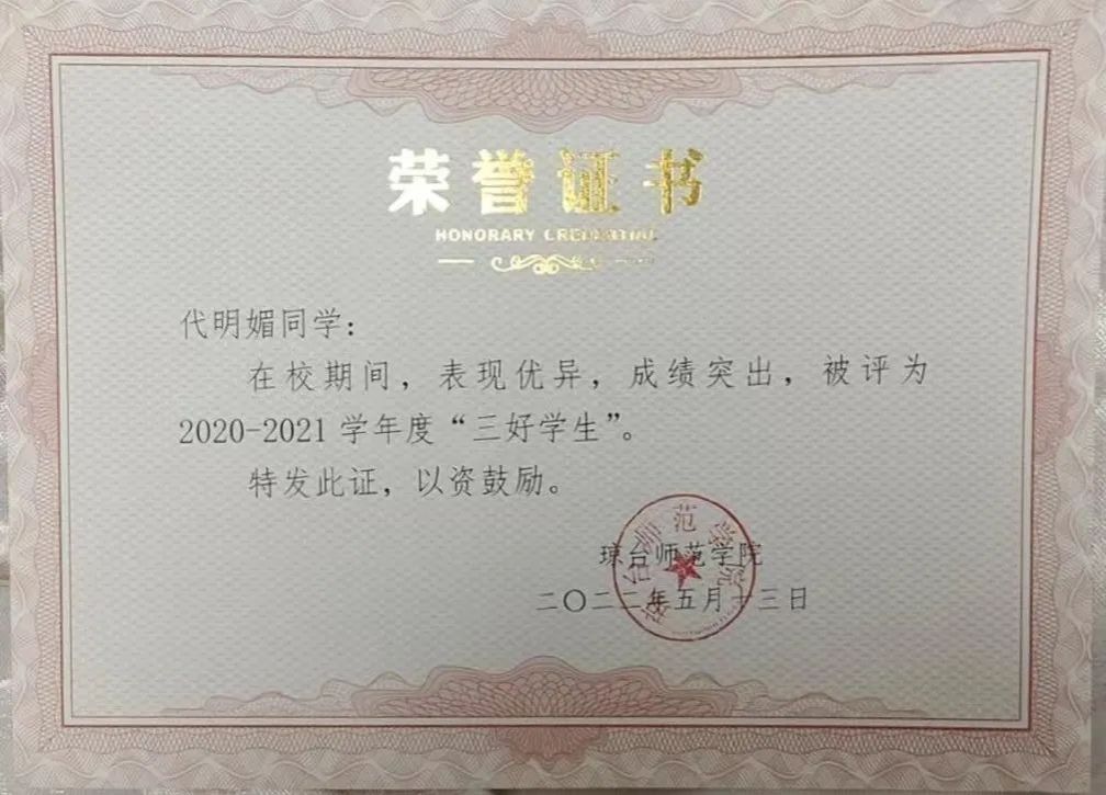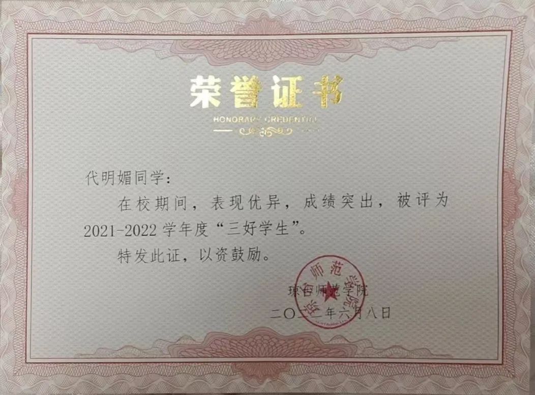 代明媚同学她始终认为学习是学生的头等大事,深深明白学习的重要性。她刻苦努力,一丝不苟,勤奋努力,勤于动脑。在课堂上,她认真听讲,积极发言,遇到不理解的地方也常常向老师请教,向老师质疑。在学习上做到不拖拉,提前预习,和其他同学共同探讨疑难问题,共同进步。她在2019-2020学年获校一等奖学金,2019-2020学年获校三好学生,2020-2021学年获校一等奖学金,2020-2021学年获校三好学生,2021-2022获校三好学生,2022-2023获校一等奖学金,2022-2023获校三好学生。她在学习上不断激励自己,也不断影响身边的同学一起进步。