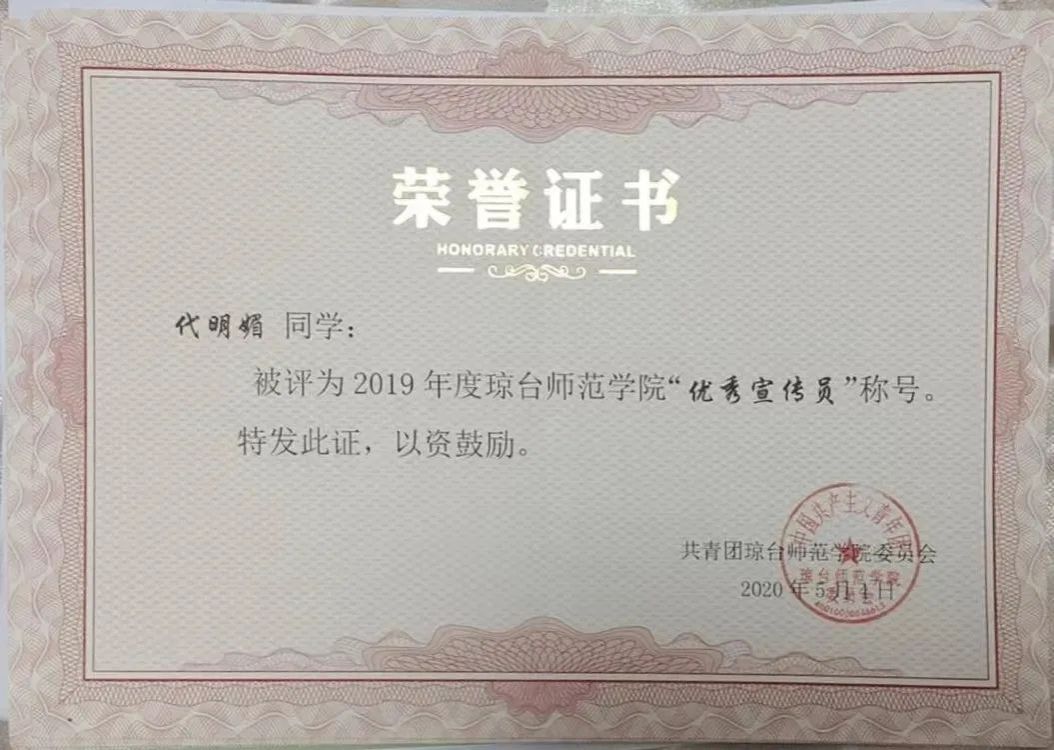 作为一名学生干部,她始终保持着积极的热情、坚定的信念和强烈的责任心。从大一入学开始,先后担任班级学习委员、组织委员,太阳成集团122ccvip团委新媒体中心运营部副部长等职,身兼多职的她时刻以大局为重。在新媒体工作中,她从一名普通的干事,成长为新媒体中心运营部副部长,从单一的服从执行成长到可以统筹策划各项活动,她在这个团队里学会了奉献和拼搏,收获了信任与友谊。她忙碌的身影出现在一年一度的迎新晚会、毕业晚会、校园歌手大赛及各类大学生风采展示,以及每逢重大纪念日校园内举行的各类特色活动中。在太阳成集团122ccvip从事新媒体工作期间,她积极与新媒体干部交流经验,丰富彼此的知识,取长补短,共同进步,加强干部之间的感情。她曾荣获2019年度优秀宣传员等荣誉,被评为校优秀学生干部。
