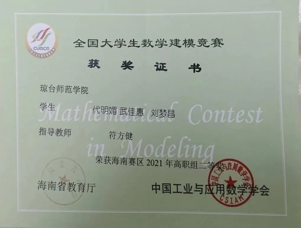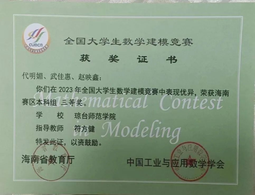 2021年全国大学生数学建模竞赛海南赛区三等奖
