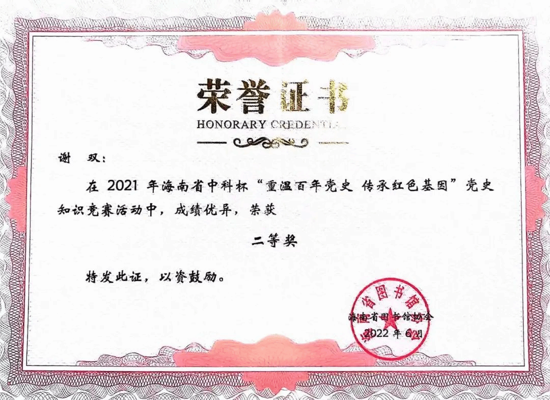 2022年6月获海南省中科杯“重温百年党史 传承红色基因”党史知识竞赛二等奖