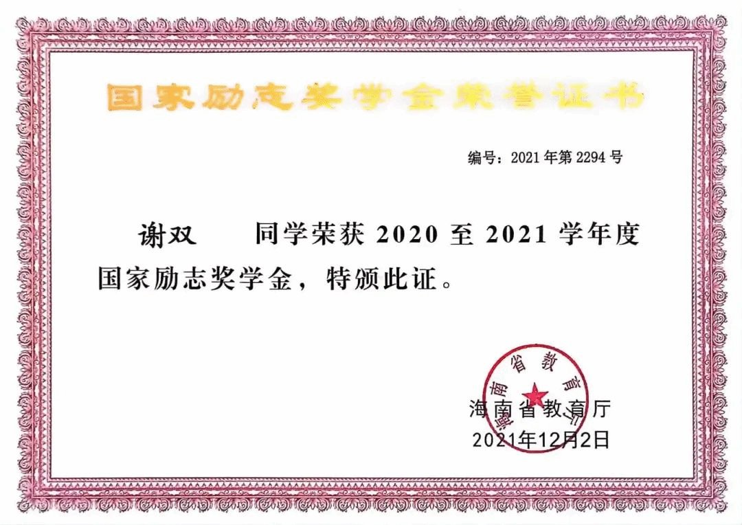 2020-2021学年度获得国家励志奖学金