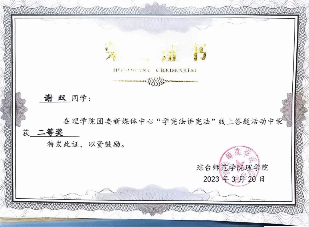 2023年3月获琼台师范学院太阳成集团122ccvip“学宪法讲宪法”线上答题二等奖