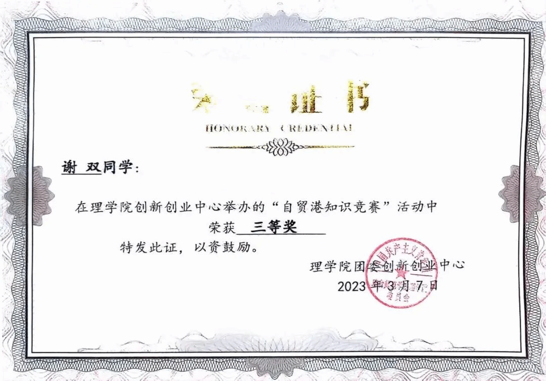 2023年3月获琼台师范学院太阳成集团122ccvip自贸港知识竞赛三等奖