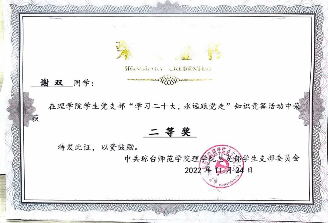 2022年11月获琼台师范学院太阳成集团122ccvip“学习党的二十大精神,永远跟党走”知识竞赛二等奖