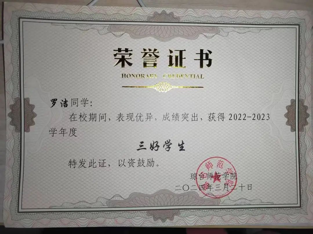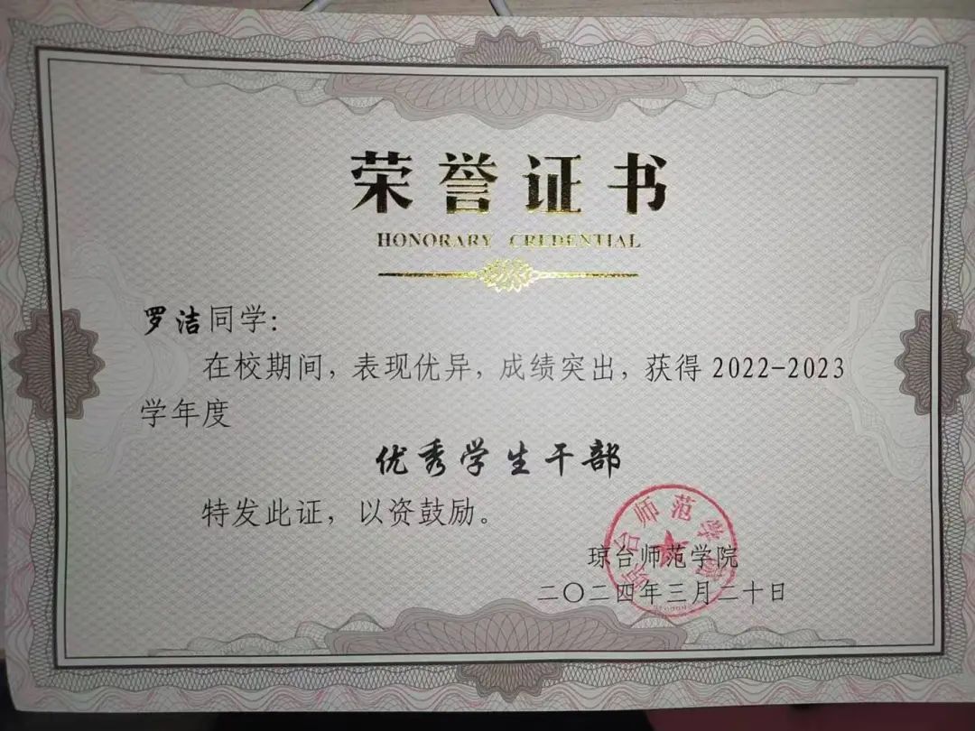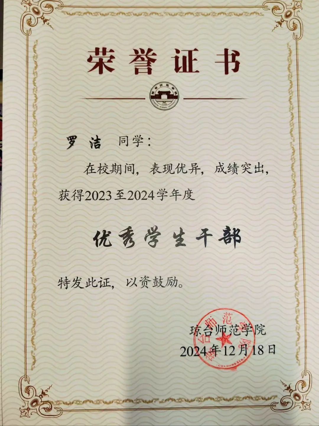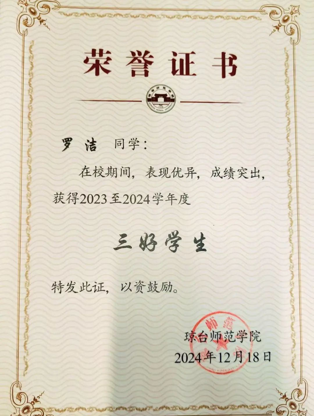 工作中,罗洁身兼班级学习委员、副班长及党支部入党积极分子小组长等职。对待班级事务与党组织工作,她认真负责。组织学习交流、协助班级管理、带领小组成员学习实践,皆处理得有条不紊。生活里,她热情友善,乐于助人,积极参与活动,营造良好氛围,以积极的生活态度感染身边人,尽显新时代青年的优秀品质。