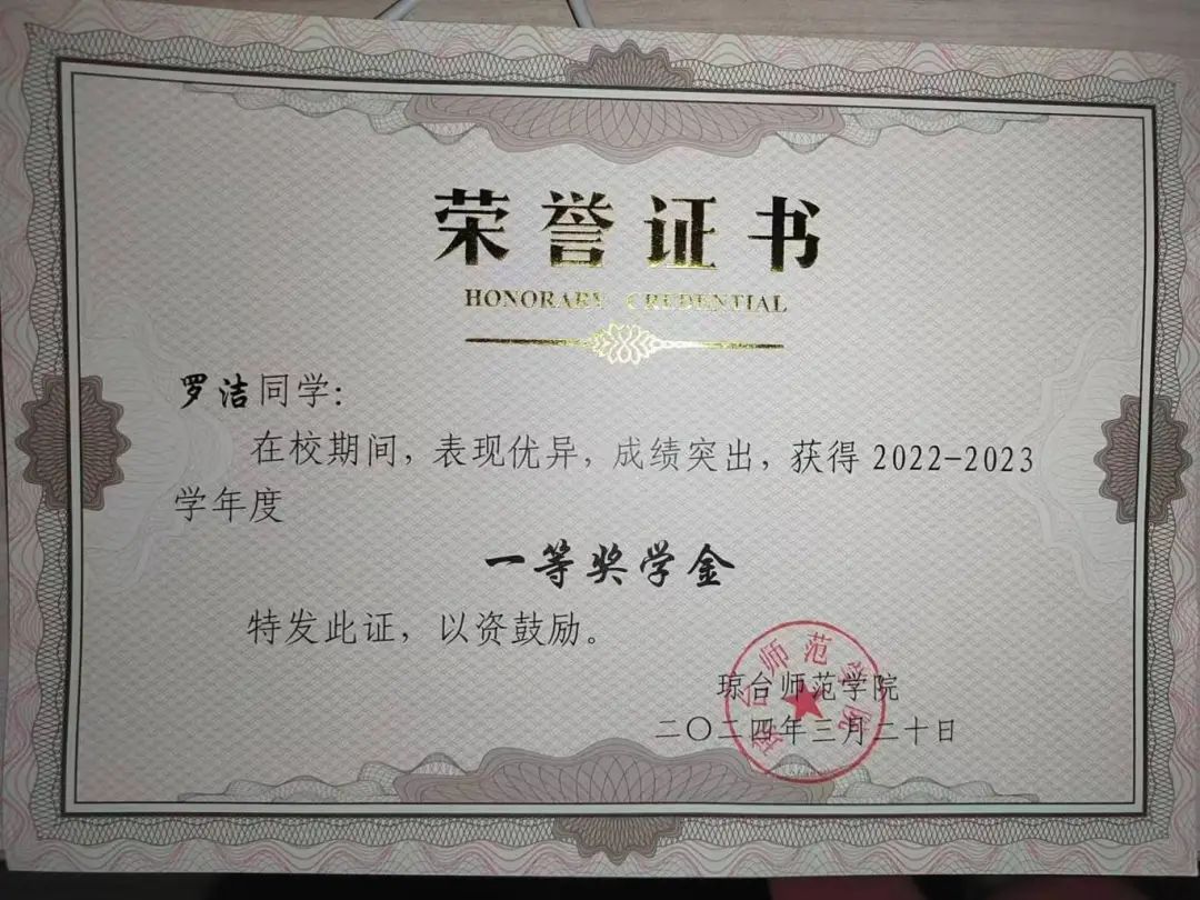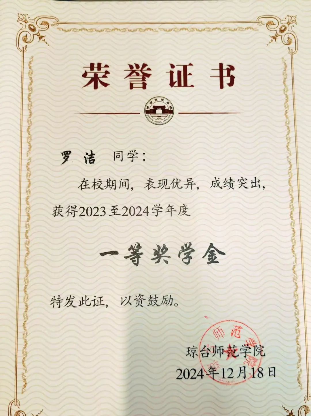 学习上,罗洁展现出令人赞叹的刻苦精神与卓越学习能力。大一至大三,她稳居班级成绩榜首,专业排名前列。面对复杂的数学知识,她毫不畏惧,课堂专注、课后拓展,勇于实践探索。这份努力让她多次斩获国家励志奖学金、校一等奖学金,无疑是同学们学习的标杆。
