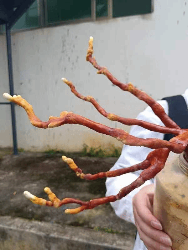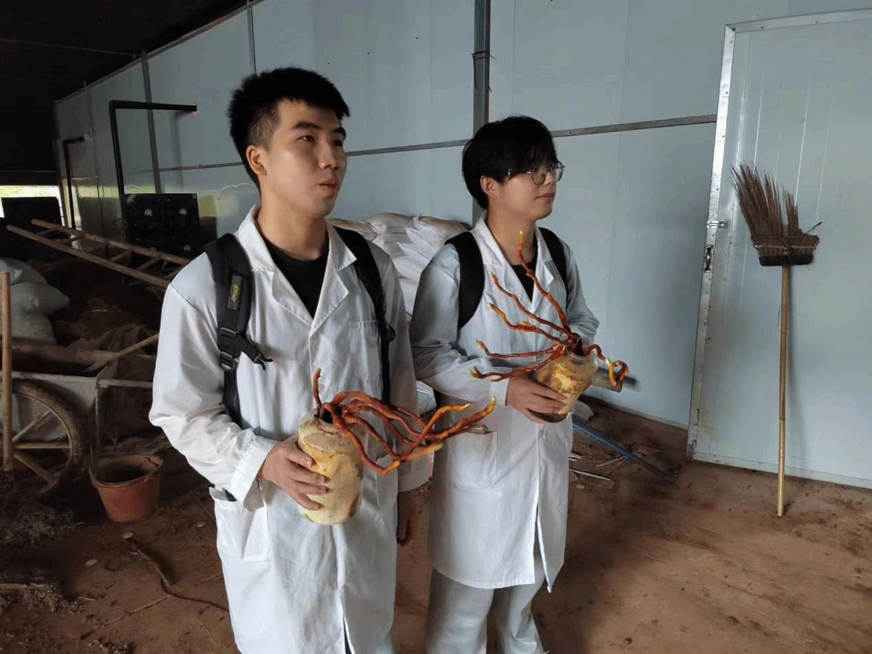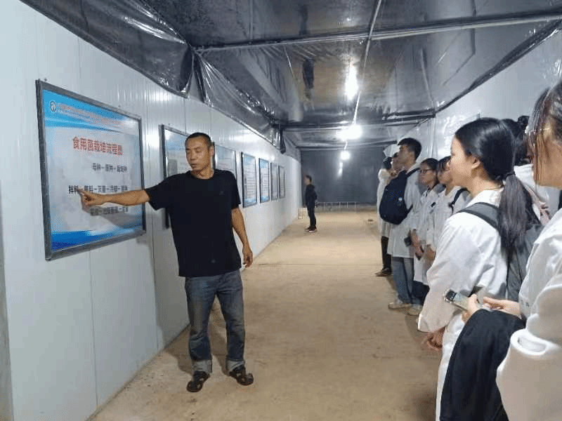 第二步:2021生物科学班的同学们来到了食用菌栽培场地,杨老师给同学们一一介绍了食用菌的知识,包括猪肚菇、黑皮鸡枞、赤灵芝、鹿角灵芝、玉木耳。老师还拿出了两瓶鹿角灵芝让同学们观看,同学们亲身接触到菌类的多姿多彩,对大自然的神奇充满了好奇。