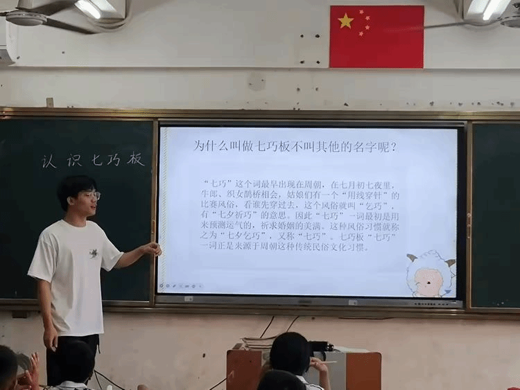 郑老师介绍,“七巧”源于周朝七夕乞巧风俗,最初用于预测运气、祈婚姻美满,七巧板的“七巧”便由此而来。