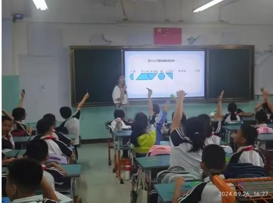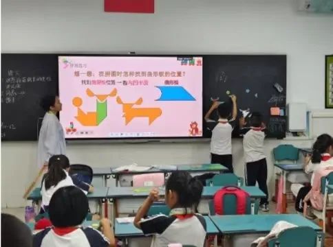 在四年级的课堂上,李老师向同学们讲解了按样拼图的技巧,还展示了如何利用两副板拼出较为简单的图形。这极大地激发了同学们的兴趣和热情,大家踊跃上台展示成果,积极参与课堂互动。