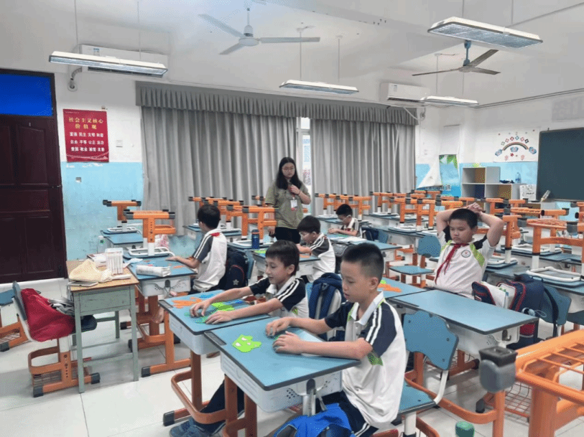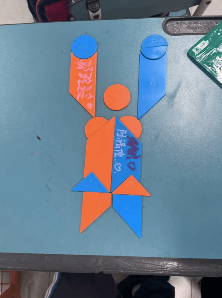 创作指令刚下达,教室里便热闹起来,却又秩序井然。蓝色、橙色、绿色的七巧板在课桌上不断组合、拆分,再组合,仿佛在进行一场欢快的 “几何舞蹈”。老师穿梭在课桌之间,既是 “灵感加油站”,遇到卡壳的孩子,会轻声引导。