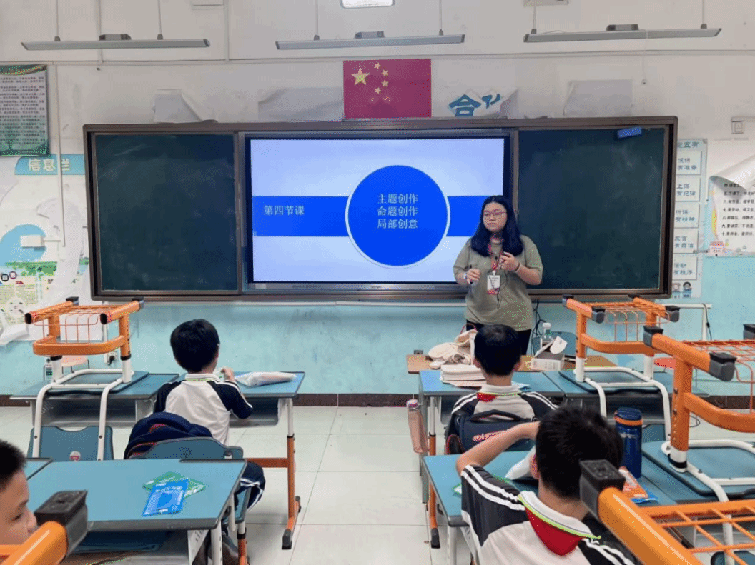 屏幕上,“主题创作、命题创作、局部创意” 三个任务模块依次闪烁,如同三把通往创意王国的钥匙。紧接着老师展示往届优秀作品。孩子们的眼睛瞬间被点亮,有的小声惊叹,有的迫不及待地拿起七巧板零件,小脑袋里装满了对创作的期待,教室中弥漫着一种既紧张又兴奋的氛围,一场创意比拼蓄势待发。