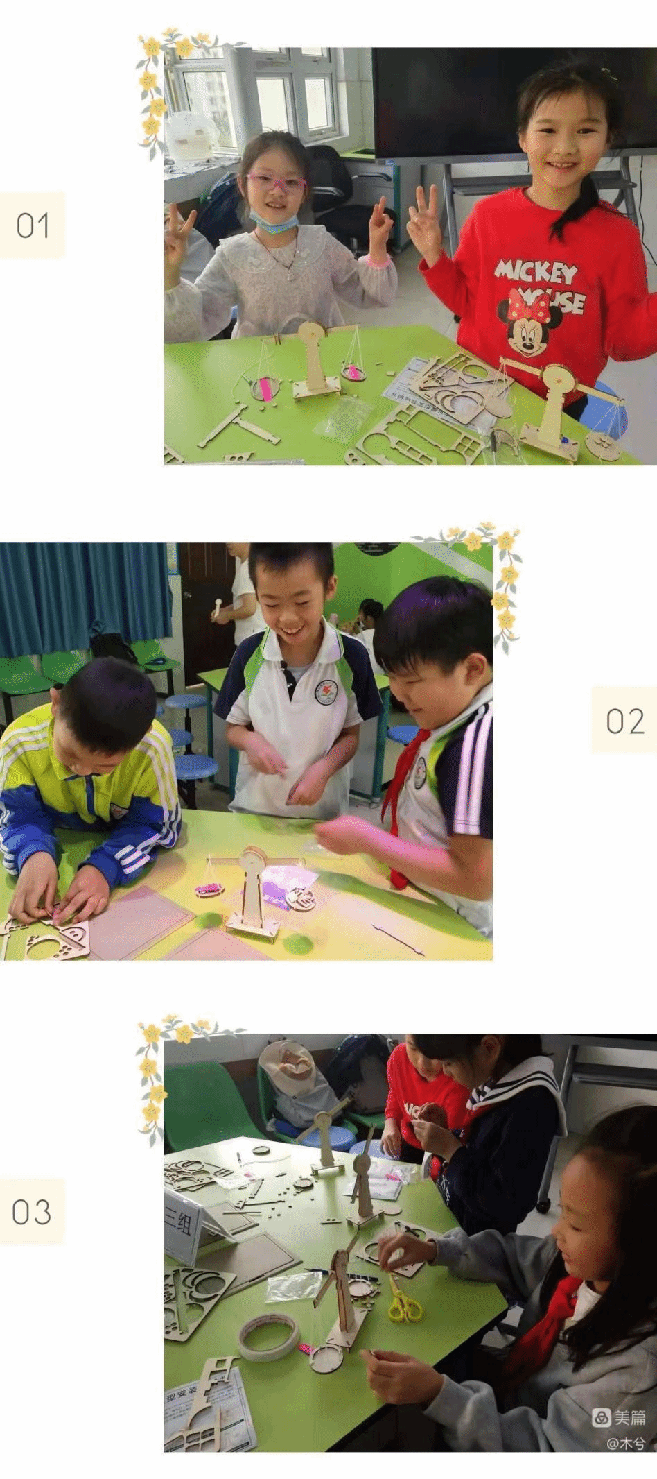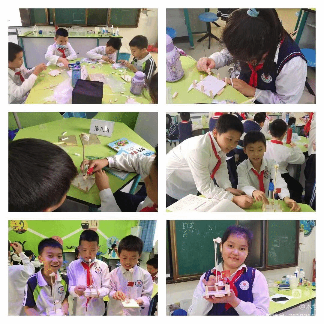 升旗的时候,旗手是怎样把国旗升起来的呢?在这个常见生活场景中藏着有趣的科学知识——定滑轮,实习老师们一边帮助同学们制作,一边讲解关于定滑轮的知识。