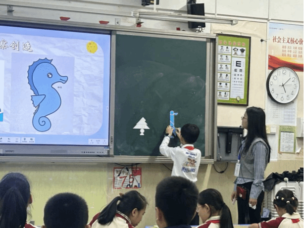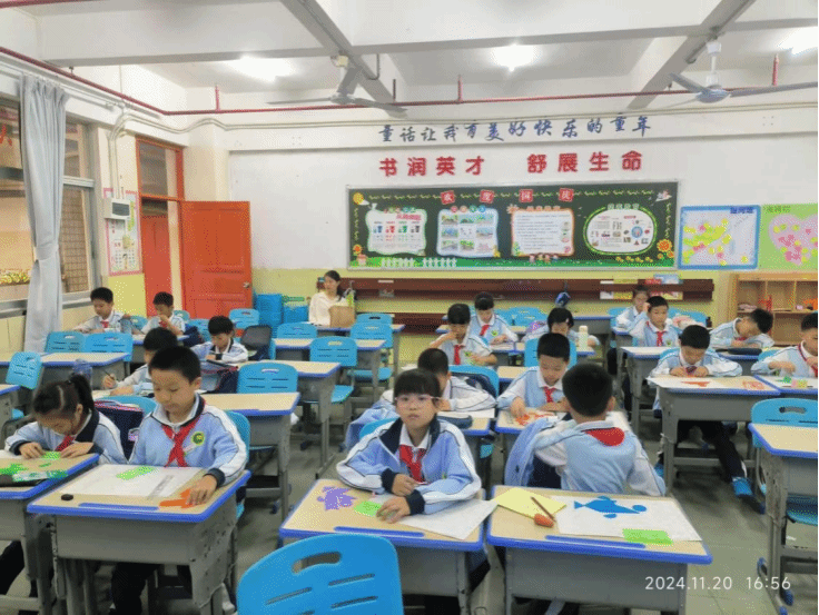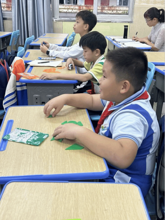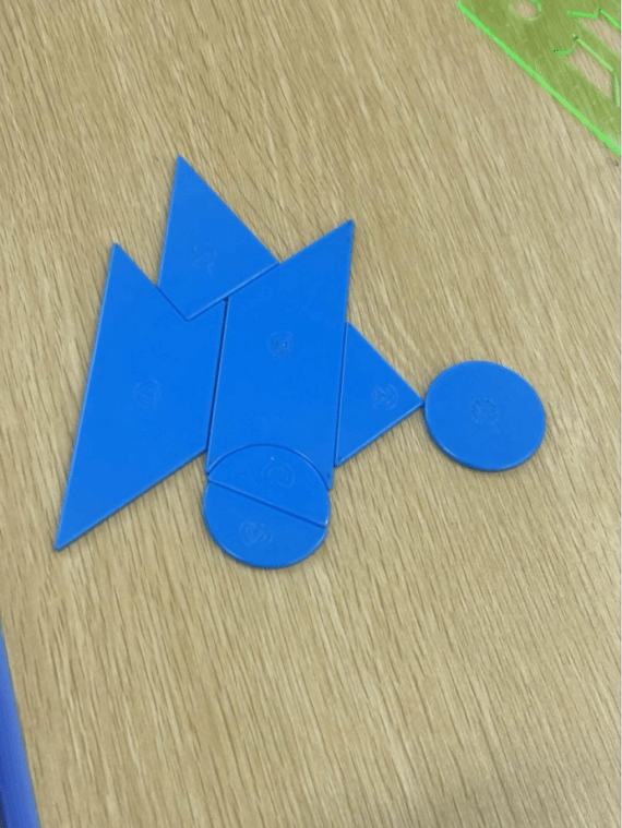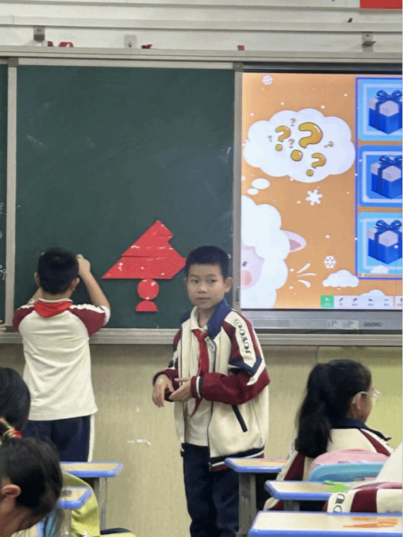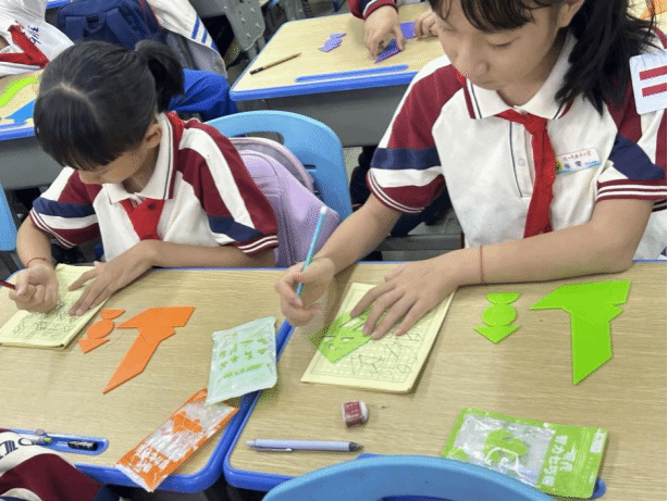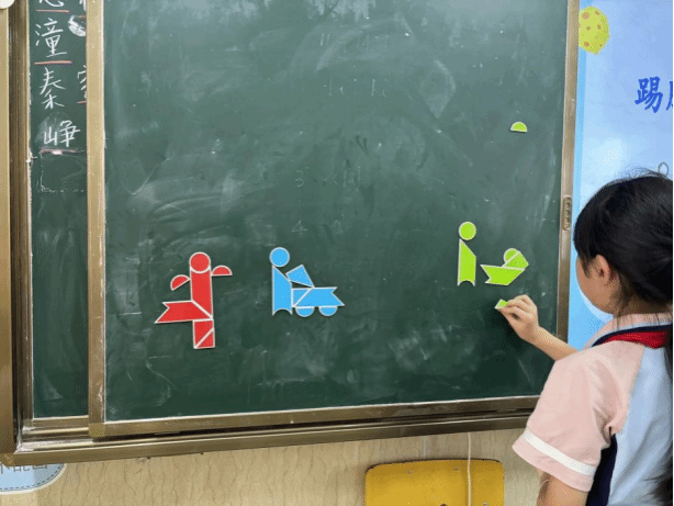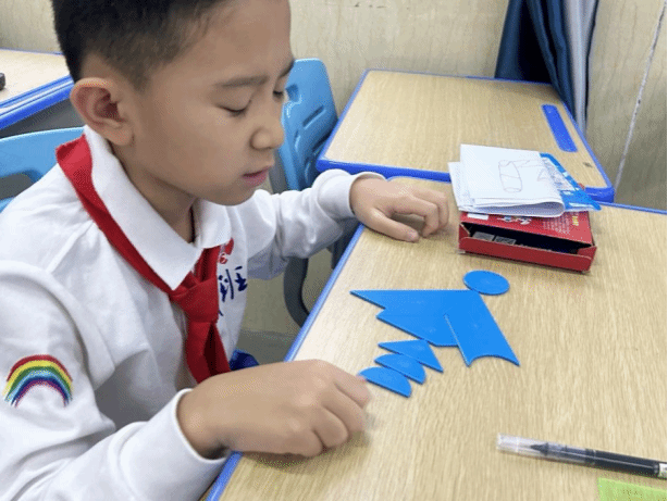 在四年级的七巧板课堂上,氛围炽热似火,同学们激情澎湃。沈老师开启教学后,同学们便紧紧围绕按题拼图的任务深度探索。此次要拼出交通工具,这极大地激发了他们的挑战欲。在沈老师的巧妙引导下,同学们迅速摆脱常规思路的限制,思维的火花在交流探讨中绚烂绽放。他们以小组为单位,展现出惊人的默契,团队协作精神熠熠生辉。每个人都沉浸在深度思考中,小手灵动地摆弄着七巧板,将动手能力发挥得淋漓尽致。从翱翔天际的飞机,到风驰电掣的列车,再到破浪前行的轮船,各种交通工具的图案在他们的巧手下逐一诞生,这些作品既独具匠心又充满童趣。同学们在这个过程中尽情驰骋想象,凭借自身的聪慧与创意,在七巧板构建的交通工具世界里畅快遨游,深切领略到数学与创意融合所带来的无尽欢乐,也让这堂七巧板课成为了他们探索数学奥秘之旅中一抹亮色。