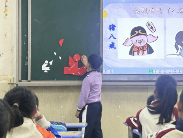 在四年级的七巧板课堂上,热闹非凡,同学们的热情如熊熊烈火般燃烧。胡老师站在讲台,目光中满是鼓励与引导,开启了此次按题拼图之旅,主题是交通工具。同学们在胡老师的耐心指引下,迅速投入到探索之中。他们毫不畏惧难题,大胆地突破传统思维的禁锢,思维的涟漪不断扩散、交织,绽放出璀璨的智慧光芒。小组内,同学们心有灵犀,配合得丝丝入扣,团队精神如旗帜般飘扬。每一个人都沉浸在深度的思考里,或眉头紧锁,或眼睛发亮,手中的七巧板在灵动的指尖上翻转、组合。同学们的想象力在此刻得到了最大程度的释放,他们用自己的聪明才智,在七巧板的方寸之间玩转出了独一无二的花样与创意,于这奇妙的七巧板世界里尽情畅游,深深感悟着数学赋予的无尽欢乐与独特魅力,仿佛每一块七巧板都成为了他们开启数学奇幻乐园的神奇钥匙。