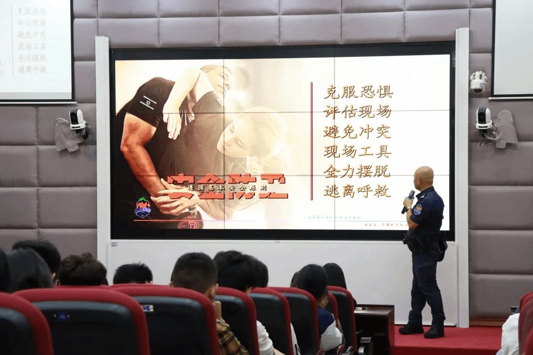 除了防身的意义、防卫理念等方面,陈副校长还进行了一些实用的近身基本防身动作的现场教学,通过对视频案例的分析让学生对自卫防身实战步骤有了更深刻的了解。