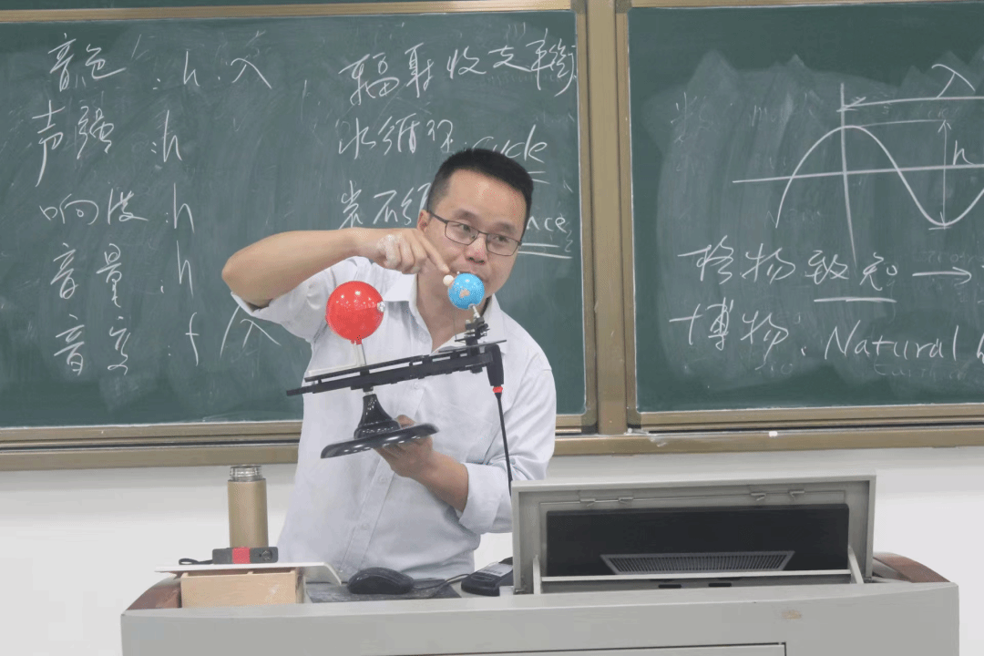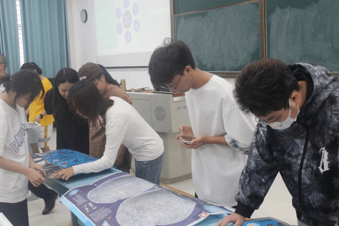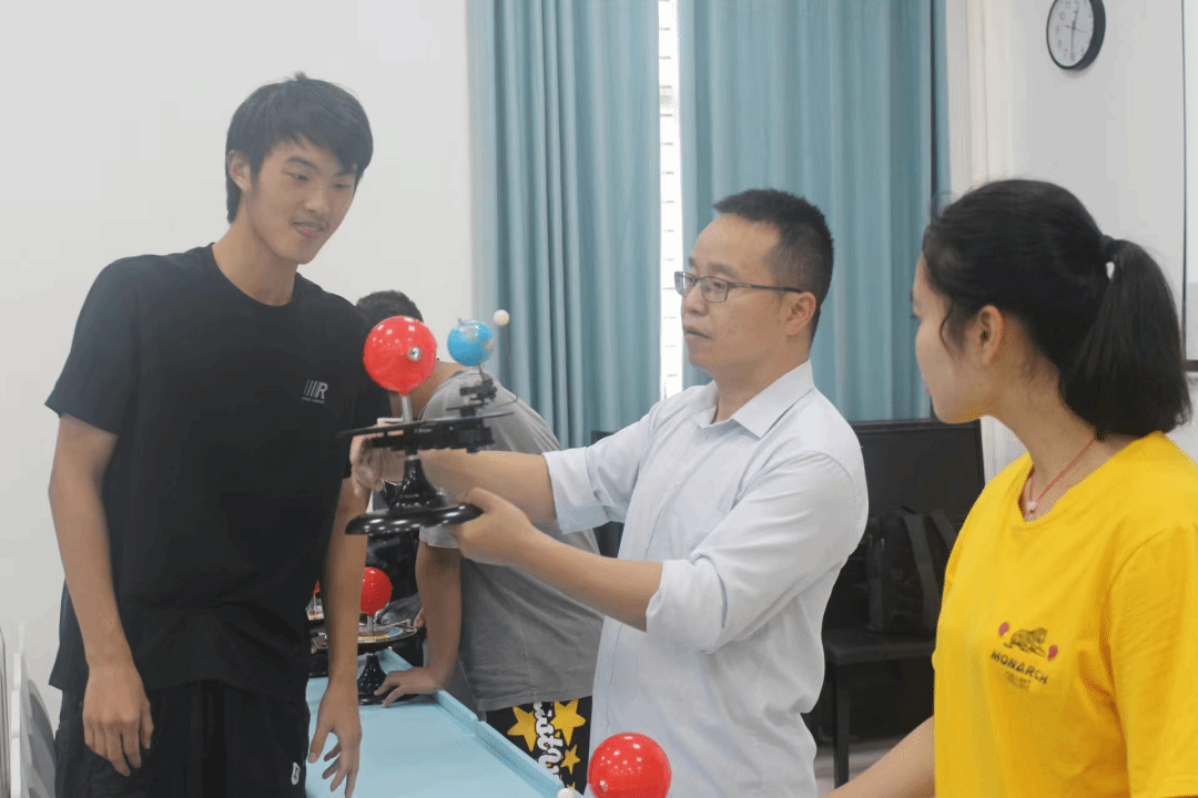 郑永春教授向同学们展示了月球全图。他表示每看一次就要产生思考,要为学生学习科学创造氛围,郑教授还用三球仪为同学们讲解了月相形。