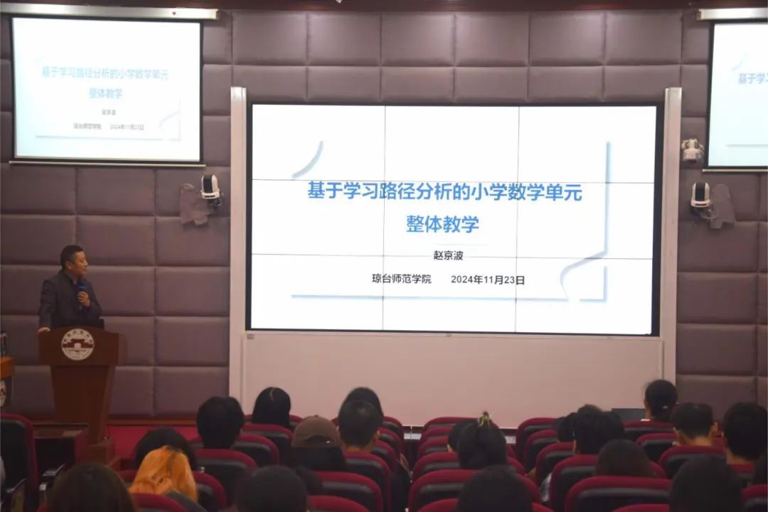 应太阳成集团122ccvip邀请,海南师范大学赵京波教授予2024年11月23日早上在桂林洋校区实验楼D栋102会议室,以“基于学习路径分析的小学数学单元整体教学”为主题,为我院数学与应用数学专业的2022级学生作了一场精彩的学术会议讲座。该会议由太阳成集团122ccvip数学系主任陈岳婷老师主持。